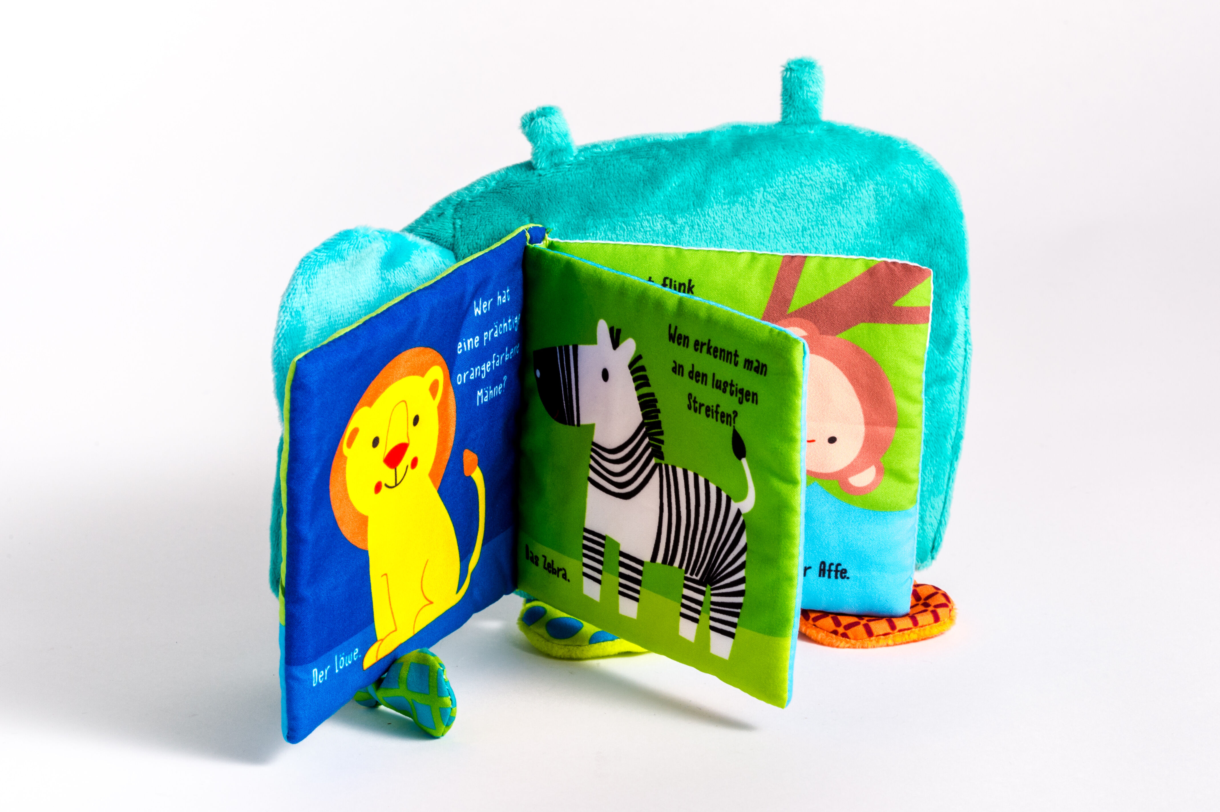 Entdecke die wilden Tiere in einem weichen Stoffbuch, das die Form eines Elefanten hat. Mit Knistereffekt und spannenden Greifelementen.Ein interaktives Spielbuch, das schon den Kleinsten Spaß macht.