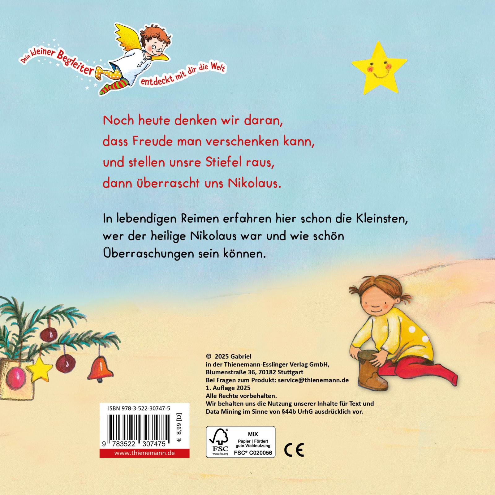 Noch heute stellen Kinder voller Vorfreude ihre Stiefel raus - doch wer war der heilige Nikolaus eigentlich? Dieses liebevoll illustrierte Pappbilderbuch für Kinder ab 2 Jahren erzählt vom Nikolaus in eingängigen Reimen, die schon kleine Kinder mitsprechen können. Es verbindet die Geschichte des gütigen Bischofs mit der Freude des heutigen Nikolaustags und zeigt, wie schön Üerraschungen sein können.