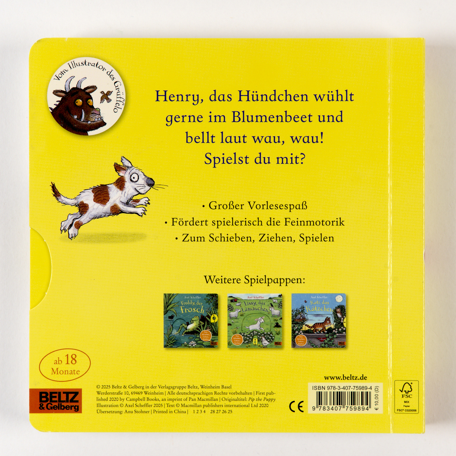 Eine vergnügliches Pappbilderbuch von dem Illustrator des Grüffelo mit einfachen und lustigen Versen, in denen kleine Kinder mit dem kleinen Hund bellen können. Mit je vier Elementen zum Schieben und Ziehen.