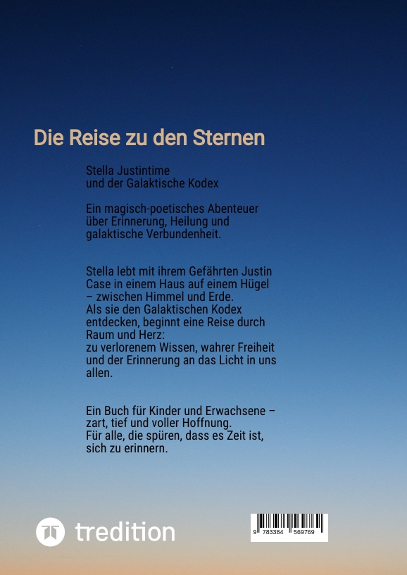 | Schlagworte | Authentizität • Didaktischer Schatz • Fantasie Erzählung • Galaktischer Kodex • Galaktisches Bewusstsein • Galaktische Wahrheit • Heilimpulse • Herzensweisheit • Kindliche Magie • Phantasie • Seelenreise • spirituelle Poesie • Verbindung von Welten • Wahre Fiktion • Zeitgeist |