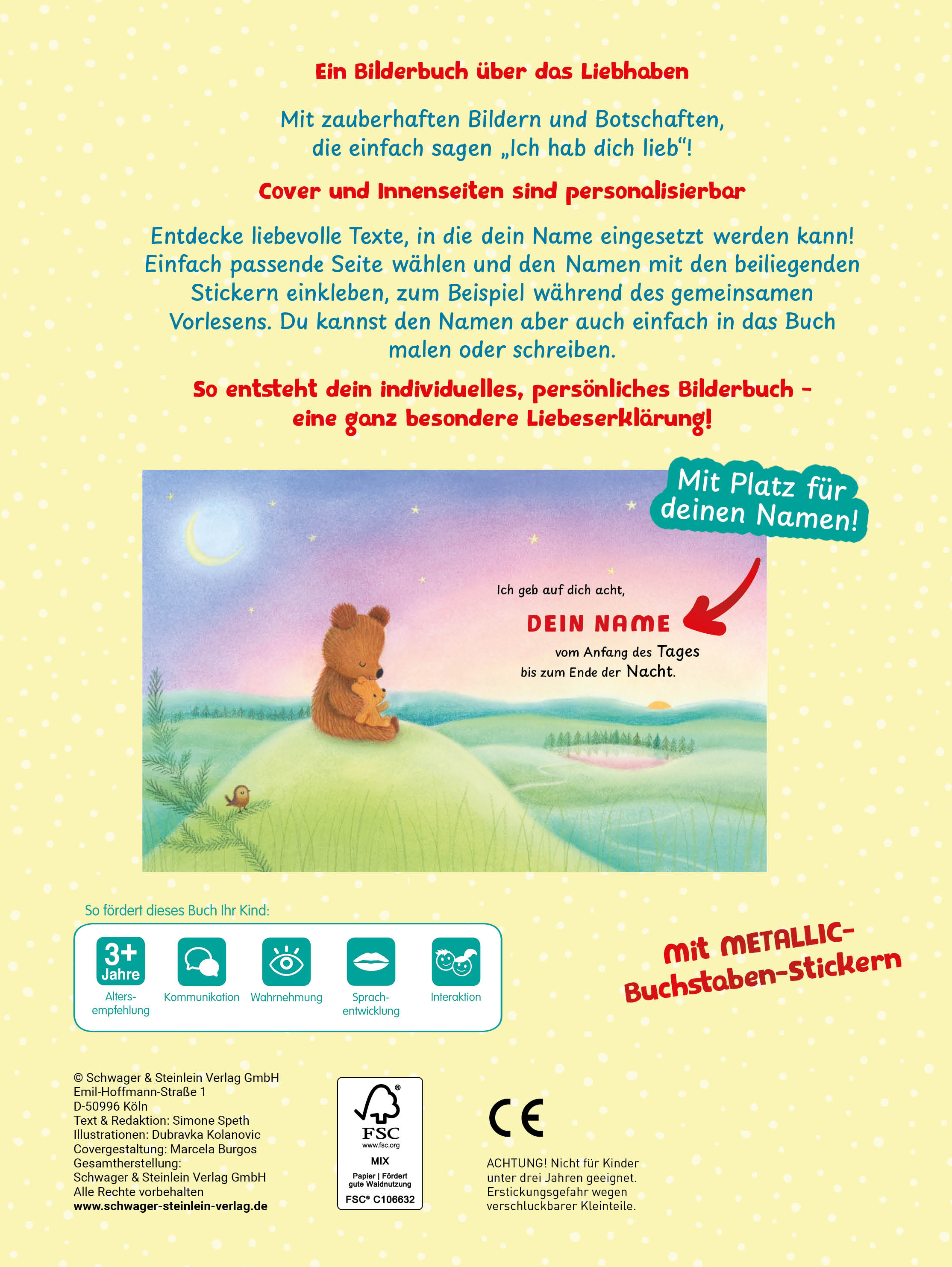 | Schlagworte | Bilderbuch • Bildergeschichten • eigener Name • Einschlafgeschichten • Erwachsen werden • für Enkel • für Jungen • für Kindergartenkind • für Kleinkinder • für Mädchen • für Neffen • für Sohn • für Tocher • Geschenk Einschulung • Geschenk für Kinder • Geschenk Geburt • Geschenk Taufe • Geschichtenbuch • Groß werden • Gute-Nacht-Geschichten • ICH HAB DICH LIEB • Kindergeschichten • Lesebuch • lieb haben • Liebhaben • mit Buchstaben • mit Buchstaben-Stickern • Mutter-Kind-Buch • Mutter-Kind-Geschichte • Name aufkleben • Namen einsetzen • Namen stickern • persölnliches Geschenk • personalisierbar • Personalisierung • persönliche Geschichten • Poesie • Schwager & Steinlein • Schwager und Steinlein • Stickern • Tier-Geschichte • Vater-Kind-Geschichte • von Oma • von Opa • Vorlesebuch • Vorlesegeschichten • Vorlesen • zum Einschlafen |