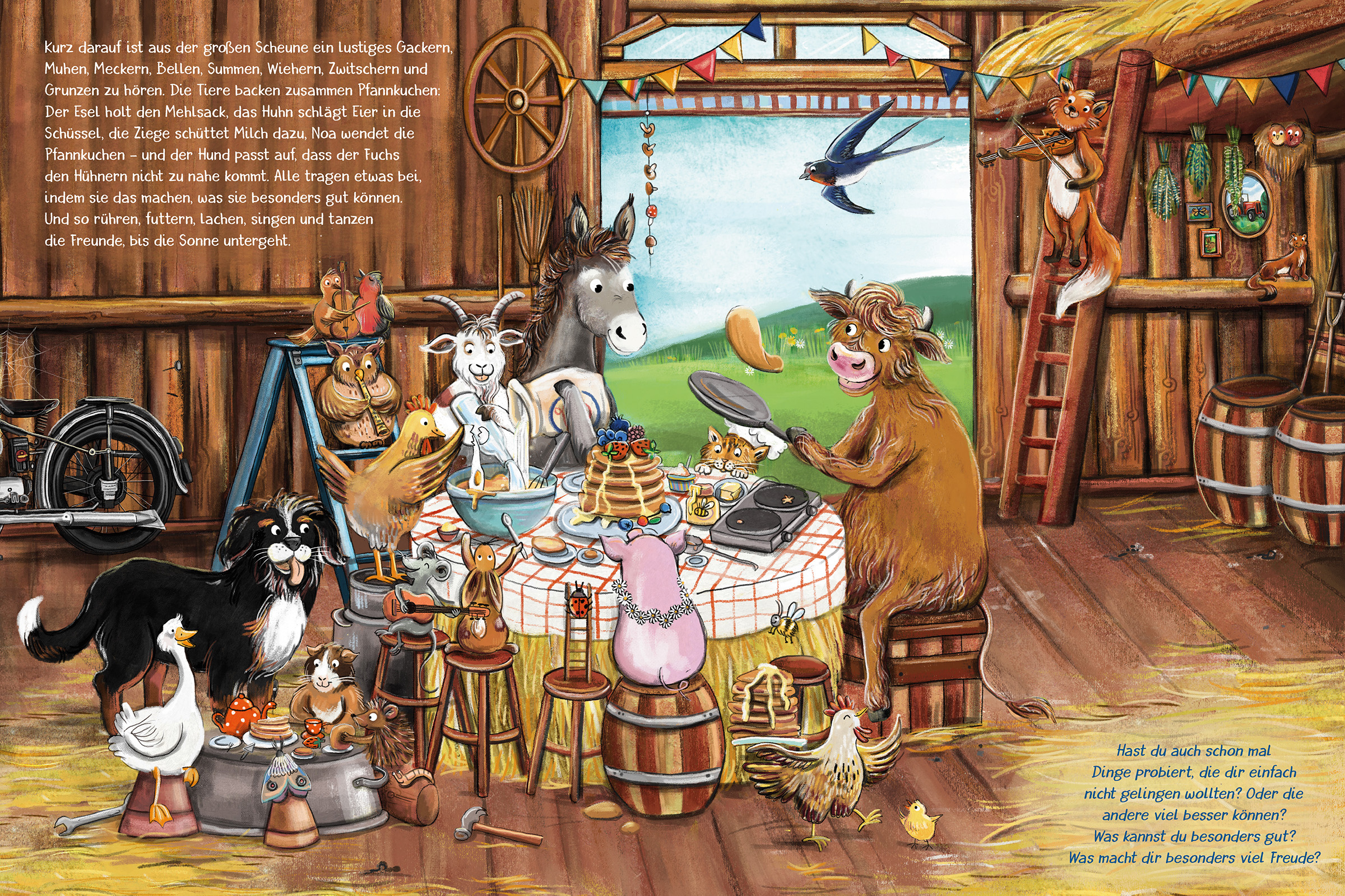 Das Kälbchen besucht seine Freunde. Doch das Huhn hat keine Zeit zum Spielen. Es hockt gackernd auf einer Blechkanne und versucht, Milch zu geben. Die Ziege sitzt auf der Stange im Hühnerstall und probiert, ein Ei zu legen. Auch die anderen Bauernhoftiere mühen sich mit Dingen ab, für die sie nicht geschaffen sind. Was ist hier los? Der Schwalbe gelingt es, die "verrückte" Situation aufzulösen. Und beim Spielen und Toben über die Wiese entfalten die Tiere ihre Begabungen. Als die Freunde gemeinsam Pfannkuchen backen, entdecken sie, dass es nichts Schöneres gibt, als mit seinem ganz besonderen Können zu etwas beizutragen, das nur gemeinsam gelingen kann. Eine unterhaltsame Bilderbuchgeschichte zum Thema Potenzialentfaltung, die dabei unterstützt, seine eigenen Stärken zu entdecken.