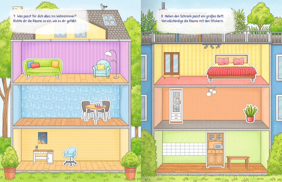 "In diesem Stickerbuch können Kinder Häuser einmal ganz nach den eigenen Vorstellungen einrichten. Mit Möbeln, Pflanzen, Deko oder Spielsachen lassen sich die Räume wie Wohnzimmer, Kinderzimmer oder Küche gemütlich gestalten. Personen und Haustiere können auch nach Belieben in die Häuser gesetzt werden. Über 500 Sticker bieten dabei viele Möglichkeiten und jede Menge Spaß."