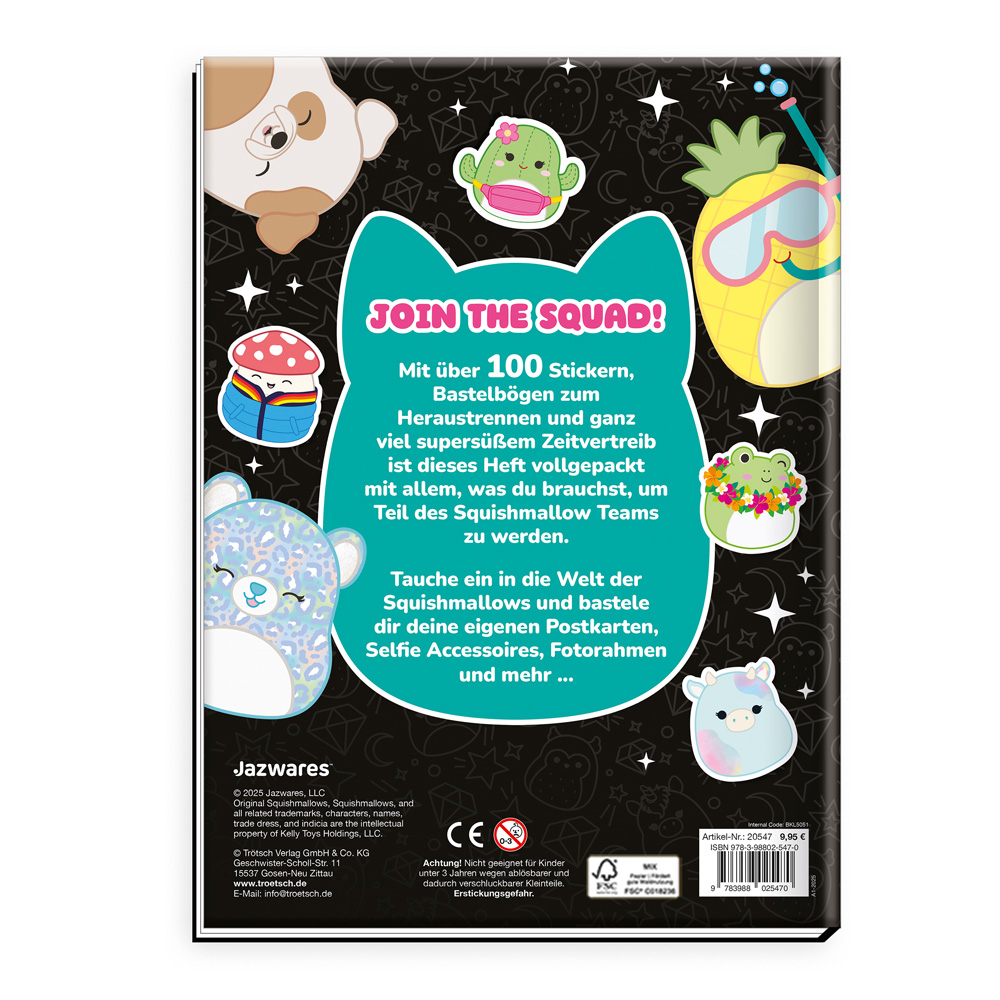 Join the Squad! Mit über 100 Stickern, Bastelbögen zum Heraustrennen und ganz viel supersüßem Zeitvertreib ist dieses Heft vollgepackt mit allem, was du brauchst, um Teil des Squishmallow Teams zu werden. Tauche ein in die Welt der Squishmallows und bastele dir deine eigenen Postkarten, Selfie Accessoires, Fotorahmen und mehr …