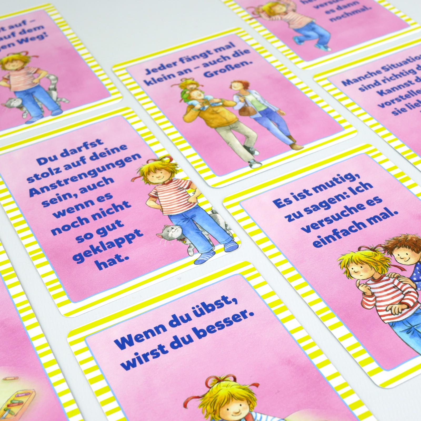 Herausforderungen in Schule oder Kindergarten, die Höhen und Tiefen des Alltags, schwierige Situationen mit Gleichaltrigen - es gibt viele Umstände, unter denen Kinder sich ängstlich oder unsicher fühlen können. Aber ihre Freundin Conni ist schon zur Stelle und bringt mit diesem Kartenset viele Mut machende Sprüche und Impulse mit, um Kindern ab 4 Jahren mehr Selbstvertrauen und Mut zu geben. Zusammen mit ihren Eltern können die Kinder eine Karte ziehen, den Spruch darauf lesen und darüber sprechen. Sie können als Hilfestellung in einer akuten Situation oder auch als tägliches Ritual verwendet werden. Mit jedem Impuls wachsen Kinder in ihrem Selbstbewusstsein und entdecken Karte für Karte ihre innere Stärke.