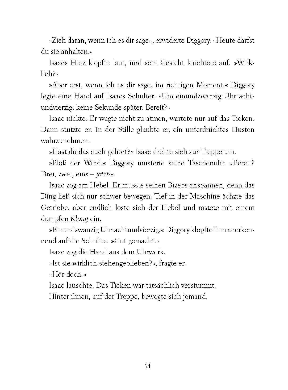 Isaac Turner ist zwölf Jahre alt. Sein Vater ist Uhrmacher in London - und zuständig für eine der berühmtesten Uhren der Welt: Big Ben in Westminster. Als die Uhr für die Sommerzeit zurückgestellt werden soll, verschwindet Isaacs Vater aus dem Glockenturm. Er hinterlässt nichts als seine zerbrochene Taschenuhr und und eine kryptische Nachricht. Auf der Suche nach Hinweisen kommt Isaac einer finsteren Verschwörung aus Regierungskreisen auf die Spur. In einem Wettlauf gegen die Zeit muss er seinen Vater retten ... und sogar die Zeit selbst!