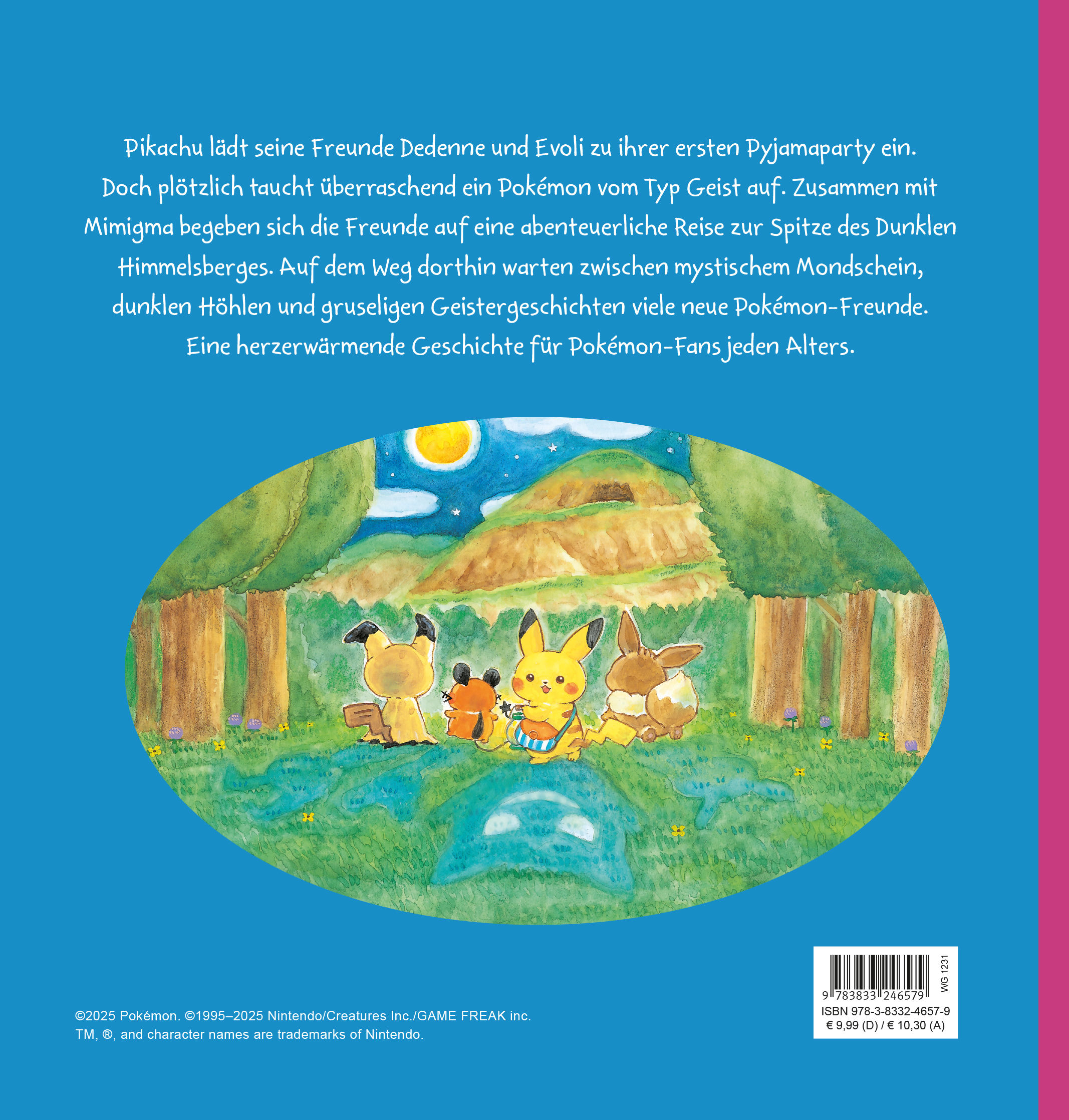 Pikachu und seine Freunde wollen ihre erste Übernachtungsparty zusammen veranstalten. Doch als Evoli anfängt, eine Gruselgeschichte zu erzählen, erscheint tatsächlich ein Pokémon vom Typ Geist! Begleite Pikachu und seine Freunde auf ihrer abenteuerlichen Nachtwanderung durch die zauberhafte Insel Monpoké und triff gemeinsam mit ihnen neue Pokémon-Freunde. Eine herzerwärmende Vorlesegeschichte mit wunderschönen Illustrationen für die kleinsten Pokémon-Fans.