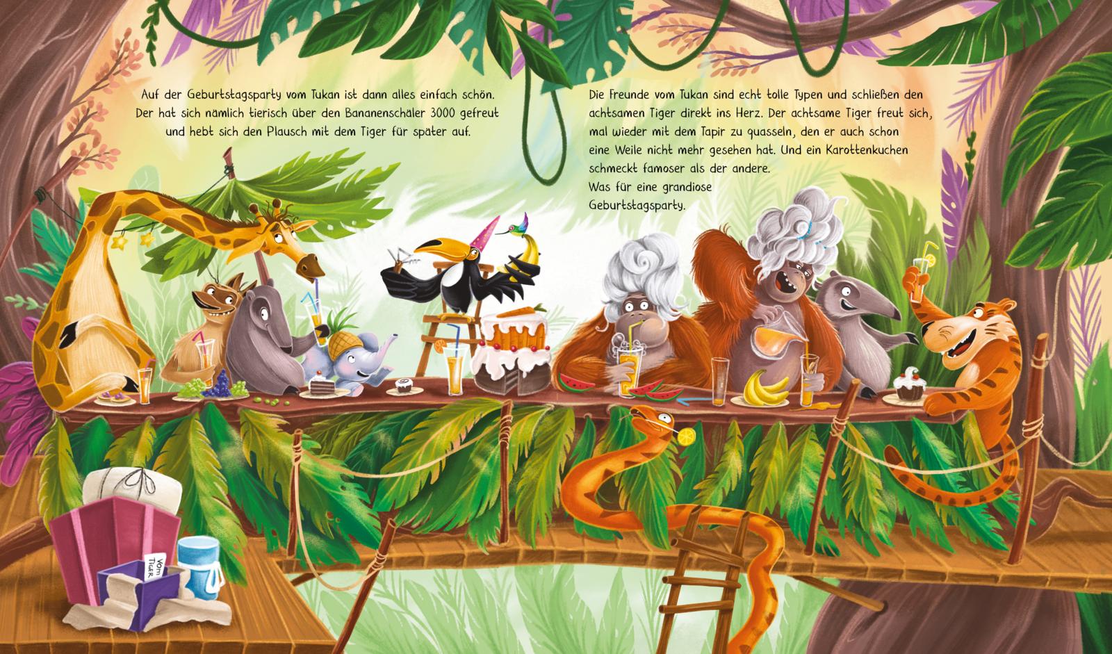 Im Urwald ist was los - der Tukan feiert Geburtstag, und alle Freunde sind eingeladen! Auch der achtsame Tiger ist dabei. Doch statt sich einfach zu freuen, wirbeln plötzlich ganz viele Gefühle durch ihn hindurch: Aufregung, Unsicherheit - und irgendwann weiß er selbst nicht mehr, was da gerade passiert.