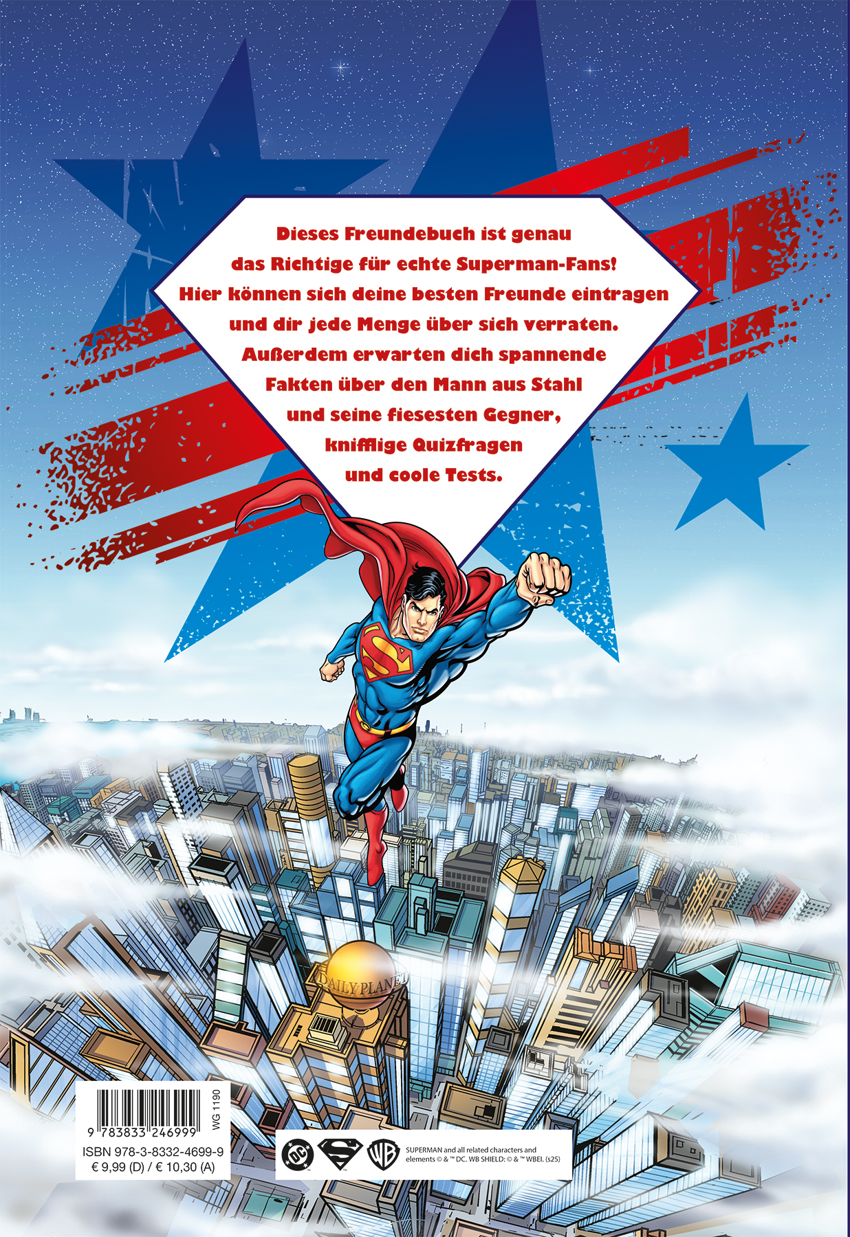 Dieses Freundebuch ist genau das Richtige für echte Superman-Fans! Hier können sich deine besten Freunde eintragen und dir jede Menge über sich verraten. Außerdem erwarten dich spannende Fakten über den Mann aus Stahl und seine fiesesten Gegner, knifflige Quizfragen und coole Tests.