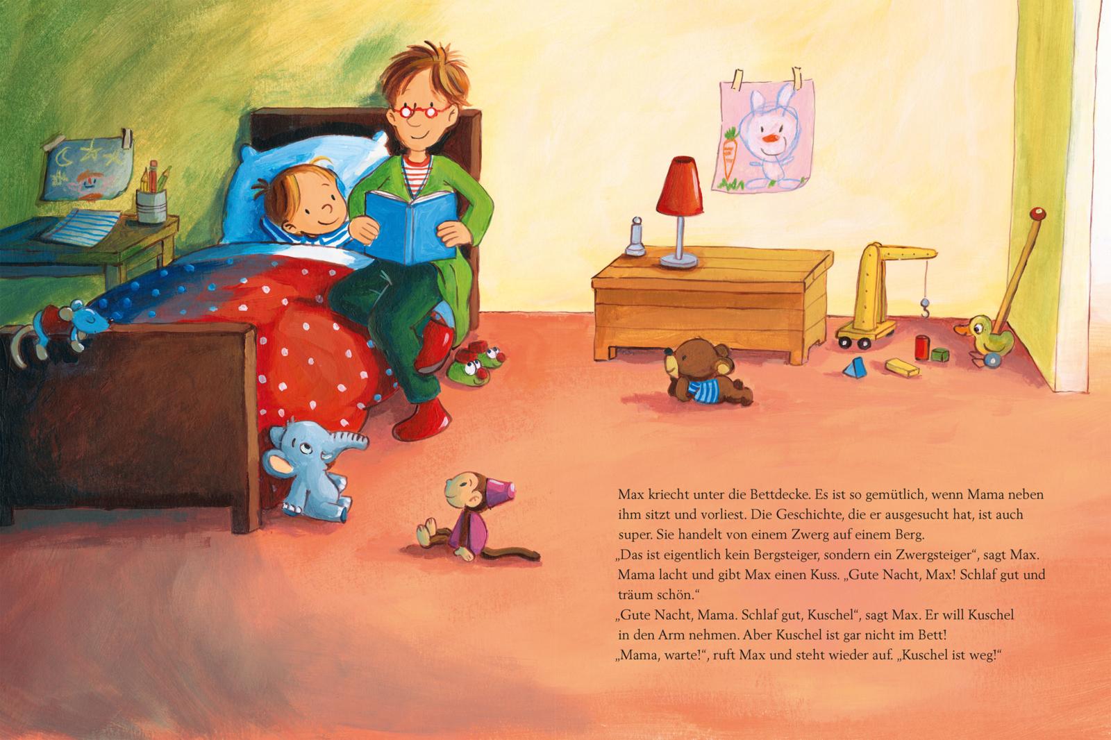 Doch schließlich findet Papa Kuschel, Max kriecht wieder unter die Bettdecke und Mama bringt ihn endlich richtig ins Bett - mit Vorlesen, Singen, Kuss und allem Drum und Dran. Schlaf schön, Max!