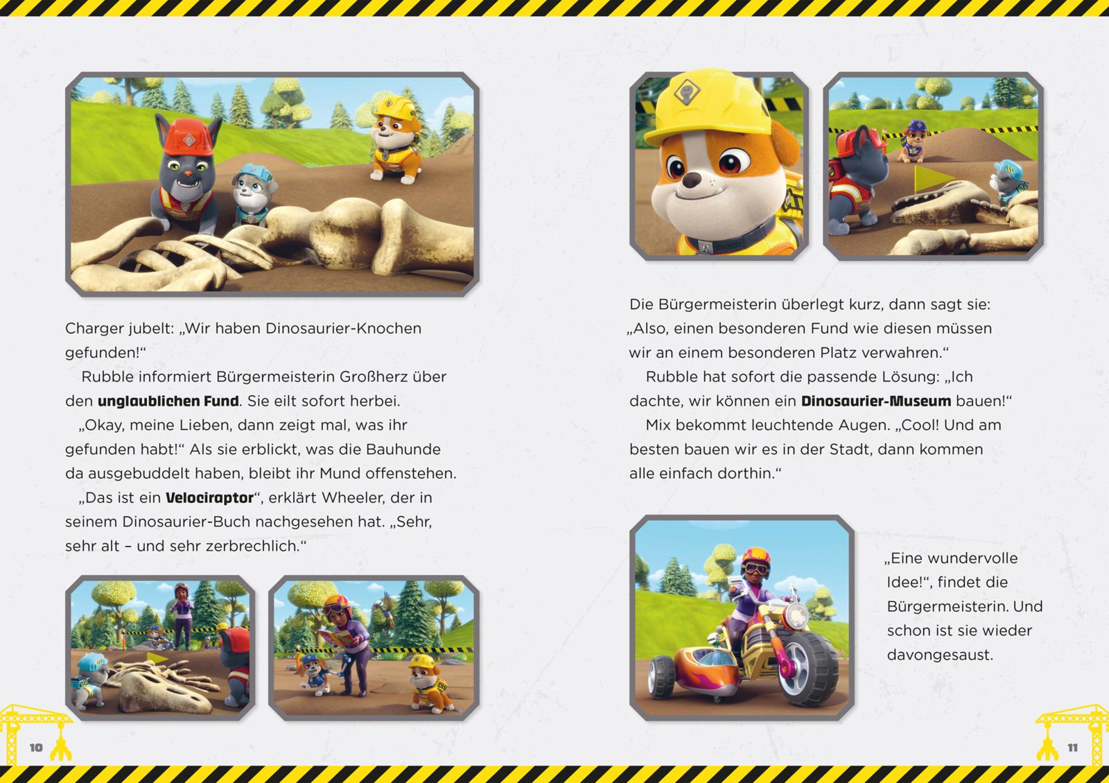 Gemeinsam mit seiner Familie sorgt der beliebte PAW-Patrol-Hund Rubble in der Baubucht dafür, dass auf den Baustellen in der Stadt alles rund läuft! Rubble, Mix, Charger, Motor und Wheeler haben bei vier Baustellen-Abenteuern alle Pfoten voll zu tun: Die Stadt braucht ein Dinosaurier-Museum, die Baupfotenfamilie will einen Skatepark für Tante Crane bauen, einen Limonadenstand errichten und begibt sich außerdem auf eine fantastische Schatzsuche! Die vier Baumissionen aus TV-Folgen der beliebten Vorschulserie werden spannend und ausführlich nacherzählt.