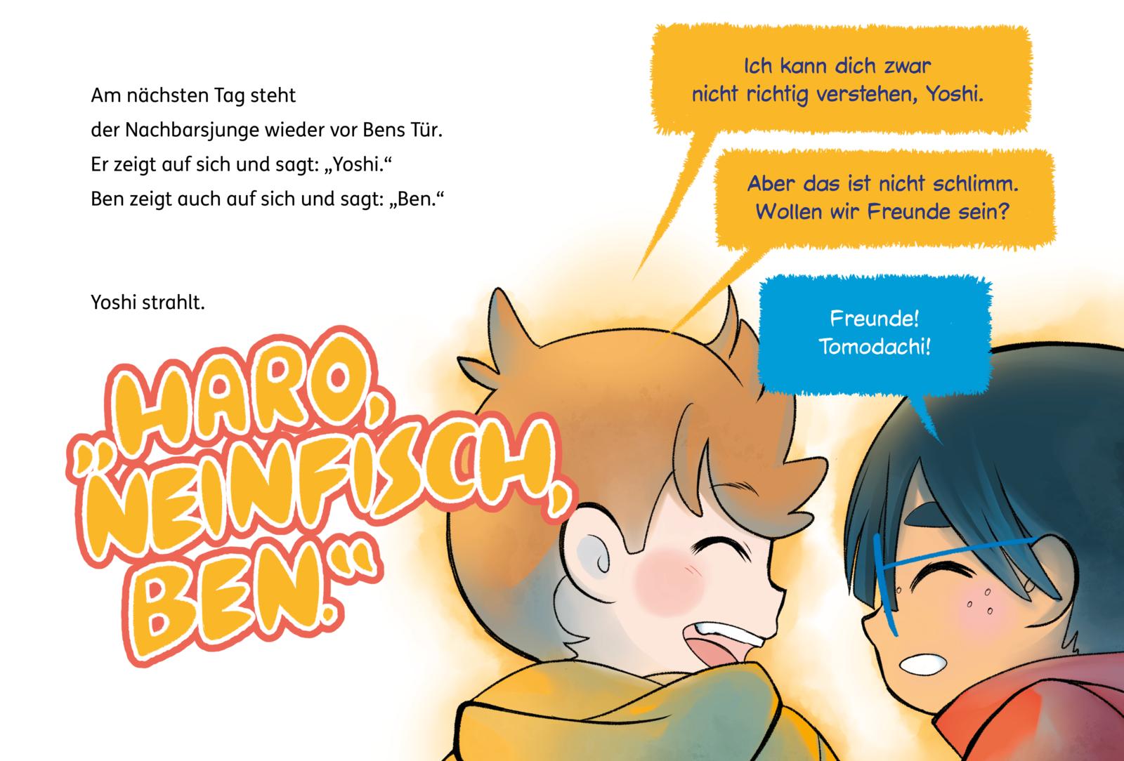 Wie soll man neue Freunde finden, wenn man ihre Sprache nicht spricht? Diese Frage stellt sich Ben, als er mit seinen Eltern nach Japan zieht. Zum Glück trifft er Yoshi - mit ihm macht Spielen auch ohne viele Worte Spaß. Schnell freunden sich die beiden Nachbarsjungen an. Sie probieren japanisches Essen, zeigen sich ihre Lieblingsspiele und lernen, was in Japan anders ist als in Deutschland. Auf einem ihrer gemeinsamen Streifzüge entdecken sie eine unheimliche Höhle. In ihrem Inneren stoßen sie auf einen echten Schatz - und auf Geister, die ihn streng bewachen! Jetzt gibt es kein Zurück mehr: Ben und Yoshi stürzen sich Hals über Kopf in ein riskantes Abenteuer.