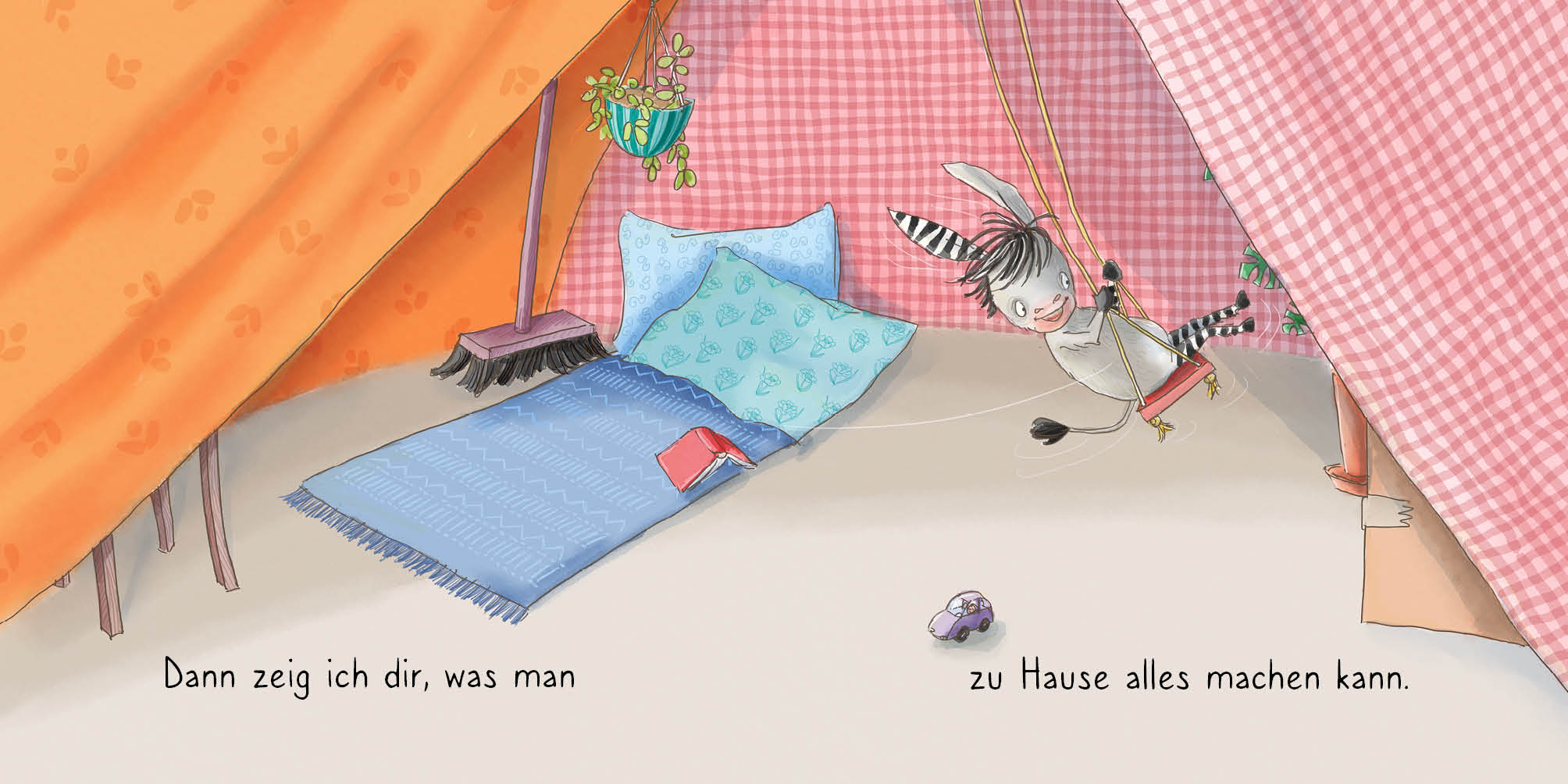 Mit dem kleinen Zesel wird es nie langweilig, denn die lustigen Ideen sprudeln ihm nur so aus den Streifen. Wenn man nicht rausgehen kann, werden eben drinnen gemütliche Höhlen gebaut. Da kann man sich wunderbar verstecken und miteinander kuscheln, in der eigenen Bi-Ba-Butze!
