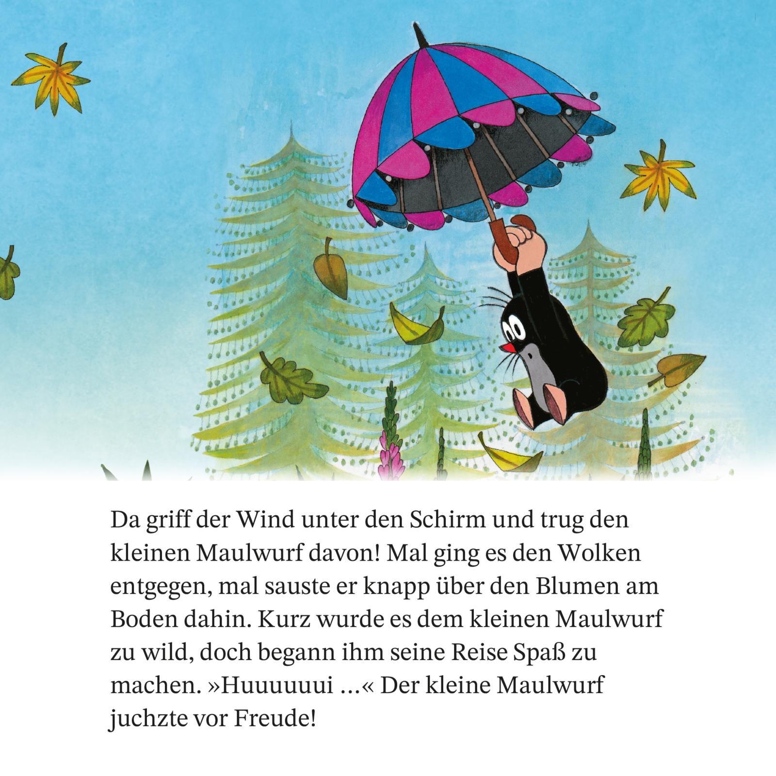 Einen Regenschirm braucht man nur bei Regen? Stimmt ja gar nicht! Als der kleine Maulwurf einen kaputten Regenschirm findet und ihn kurzerhand repariert, merkt er schnell, dass man damit auch herrlich fliegen, den Fluss entlangschaukeln und sogar den wilden Hund austricksen kann...