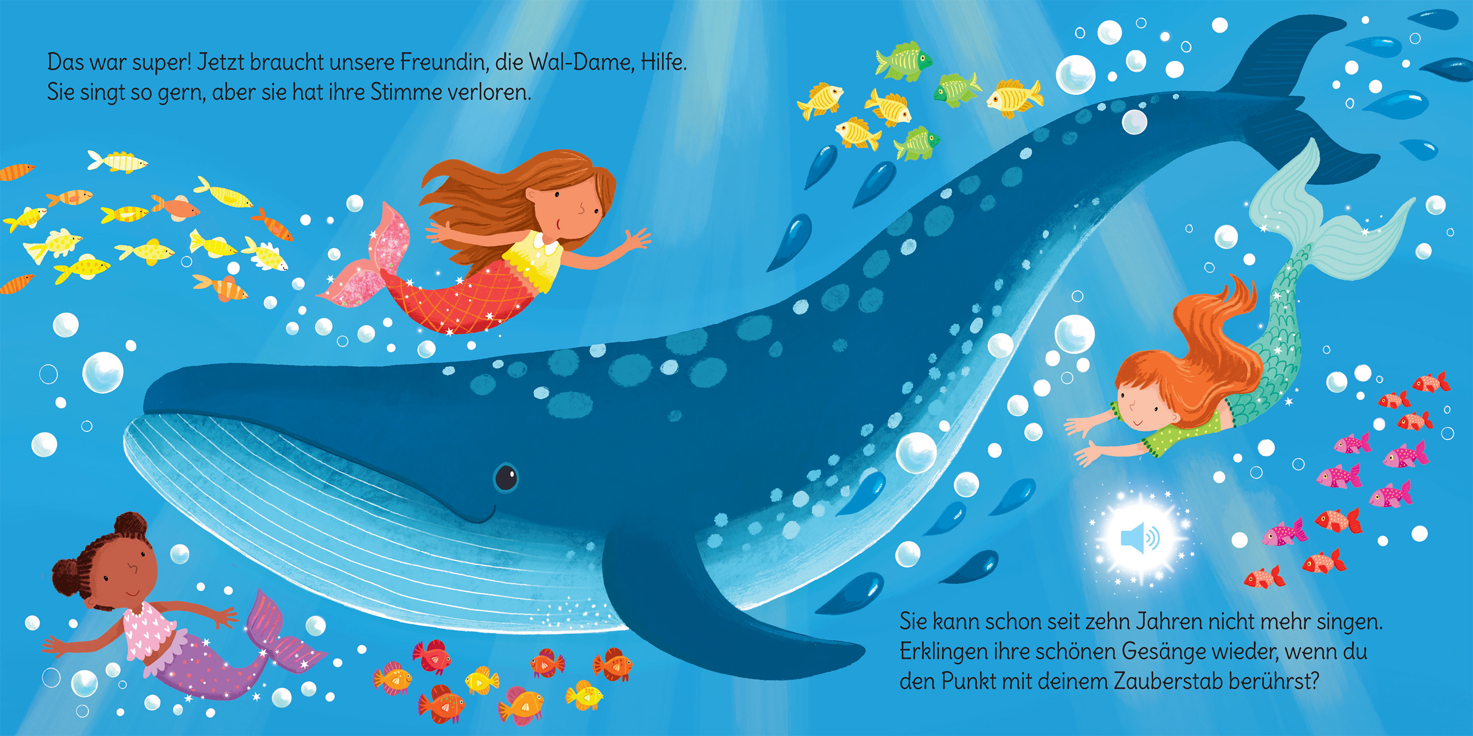 Lass mit dem Zauberstab die Töne erklingen! Die Meerjungfrauen brauchen dich, um ihren Freundinnen und Freunden in und auf dem Meer zu helfen. Benutze den Zauberstab auf jeder Seite und lausche dann dem magischen Wind, dem Lied der Wal-Dame und noch mehr zauberhaften Geräuschen.