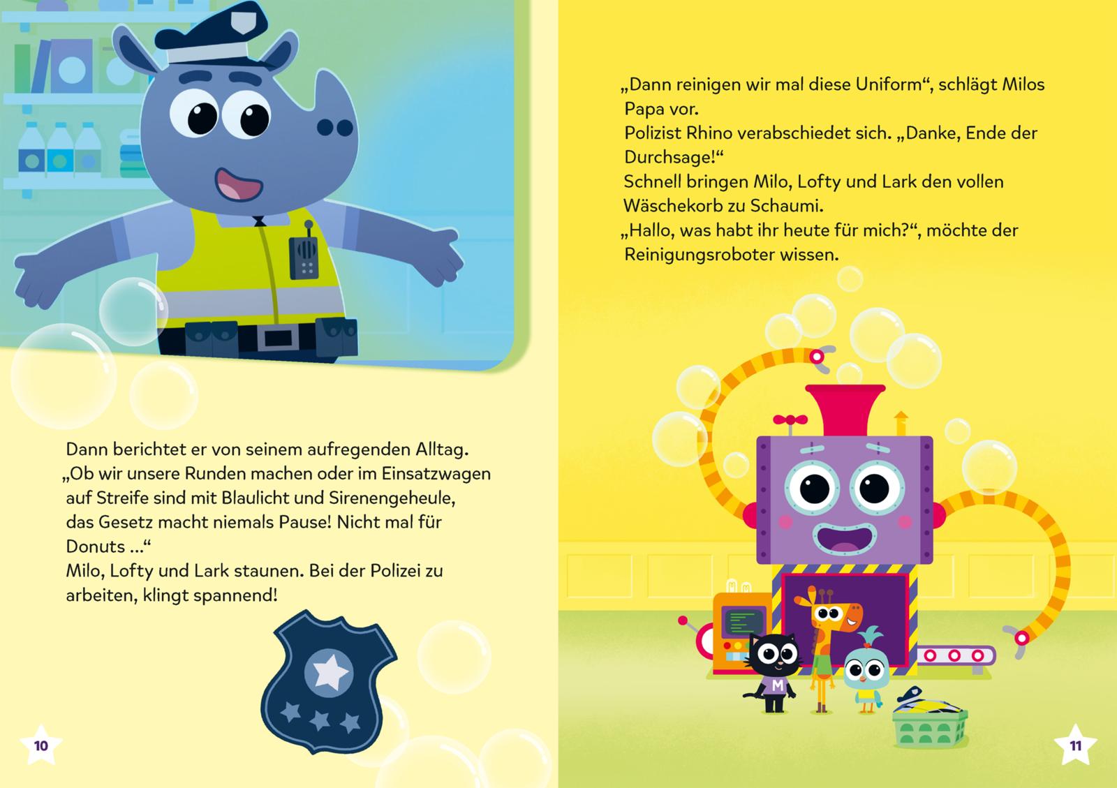Kater Milo und seine Freunde Lofty und Lark sind neugierig auf die spannende Welt der Berufe. Gemeinsam besuchen sie die Feuerwehr, helfen der Polizei, erkunden eine Weltraumstation, schauen in einer Tierarztpraxis vorbei und erleben den Alltag in einer Schule. In fünf liebevoll erzählten Geschichten lernen kleine Milo-Fans spielerisch verschiedene Berufe kennen - perfekt für neugierige Entdecker und Entdeckerinnen!