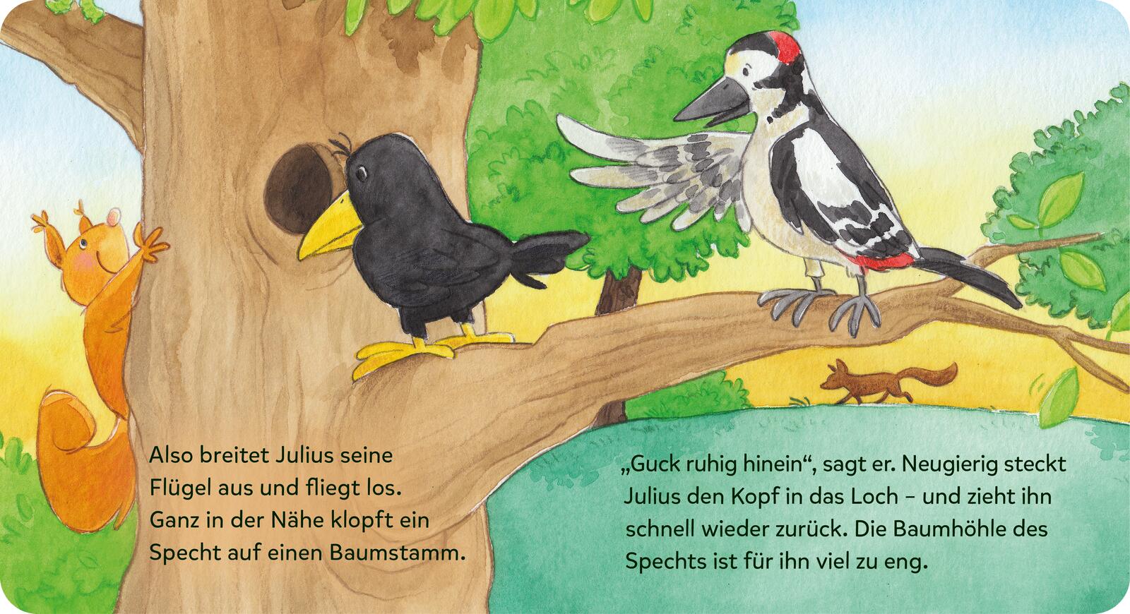 Immer wenn es Zeit fürs Bett ist, kommt das Sandmännchen mit einer Gutenachtgeschichte. Hier erzählt es den Kindern von dem kleinen Raben Julius. Er ist auf der Suche nach einem kuscheligen Nest für die Nacht. Im Wald besucht Julius die anderen Vögel, entdeckt einen Adlerhorst und sogar ein Entennest im Schilf! Aber ein richtig gemütlicher Schlafplatz ist noch nicht dabei. Zum Glück findet er schließlich einen Ort, an dem er ganz wunderbar einschlafen kann.