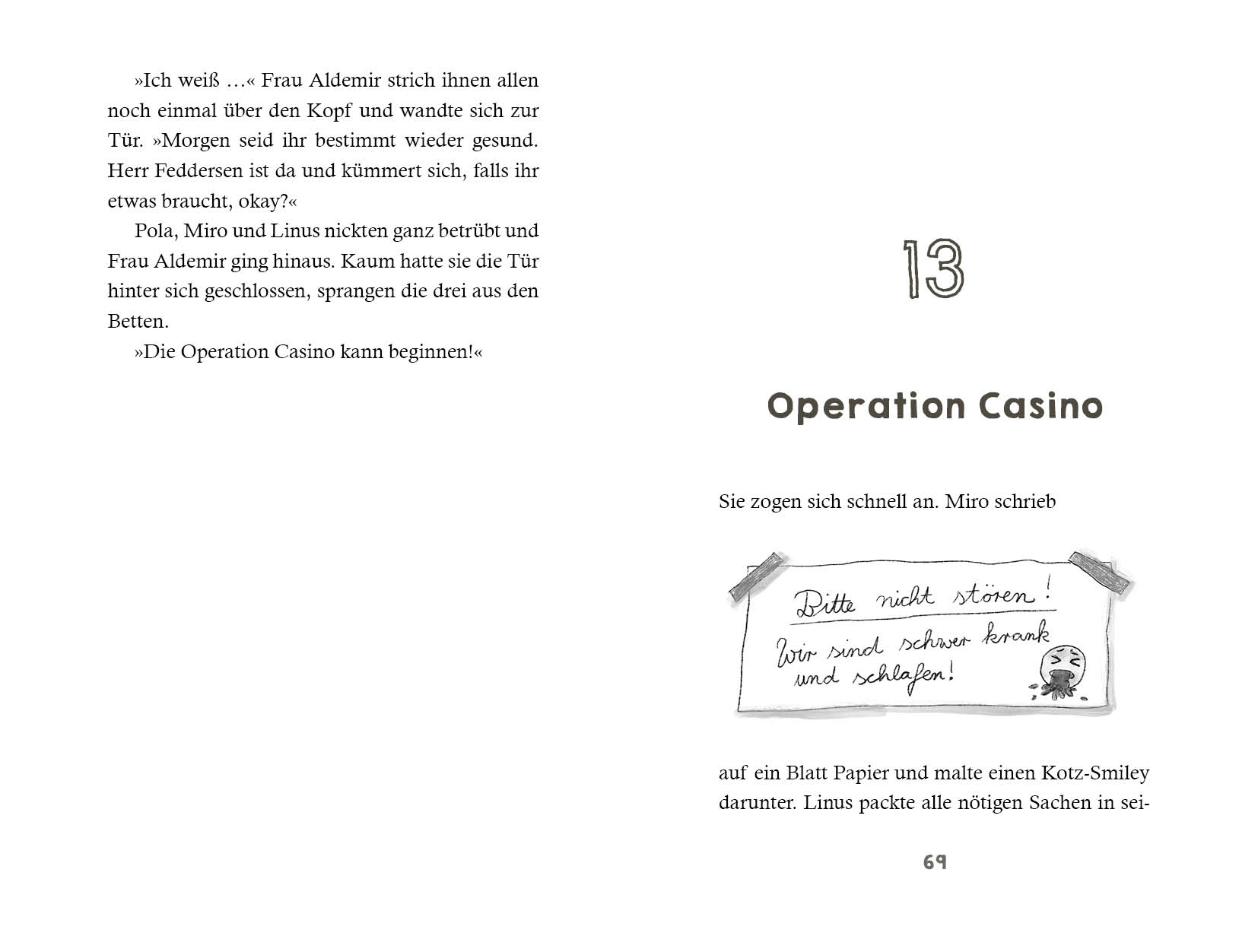 Miro, Pola und Linus sind die Schurkenschnapp-AG. Und endlich geht es nun auf Klassenfahrt. Mit Heimwehtrunk und einem Koffer voller Spezialausrüstung. Fehlt nur noch ein neuer Fall. Der kommt prompt: Im Casino gleich neben ihrer Unterkunft passieren seltsame Dinge. Ein Goldschlips hat eine Glückssträhne, eine Türsteherin macht dicht und im Keller verschwinden die Tageseinnahmen. Zum Glück sind Miro, Pola und Linus auf alles vorbereitet - und pokern hoch!