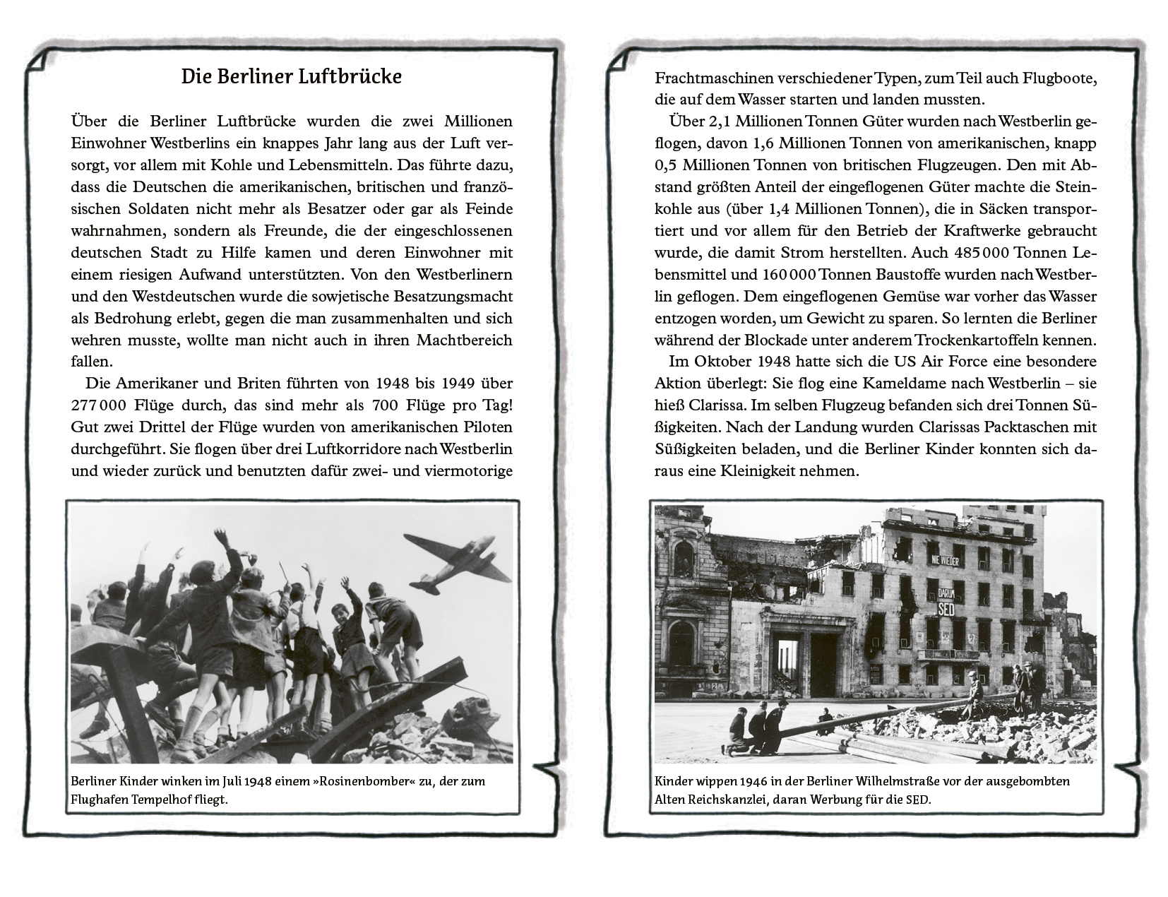 | Schlagworte | Alliierte Besatzung • Alltag in Kriegsgebieten • Alltag nach Katastrophen • Aufbruch und Neuanfang • Ausgrenzung • Befreiung • Berliner Blockade • Berliner Mauer • Besatzung • Besatzungssoldaten • Besatzungszonen • DDR • Ende Zweiter Weltkrieg • Erlebnissen in der Nachkriegszeit • Erzählendes Sachbuch • Erzählungen und Sachinformationen • Fiktion und Fakten • Flucht • Flucht und Vertreibung • Geschichte ab 9 • Geschichte Deutschlands • Geschichte Europas • Geschichte für Jungs • Geschichte für Kinder • geschichte für mädchen • Geschichtsunterricht • Geteiltes Deutschland • Hoffnung • Holocaust • Hungerwinter • illustriertes Sachbuch • Judenverfolgung • Jugend in den 50ern • kinderhelden • Kinder in der Nachkriegszeit • Kindersachbuch ab 9 • Kindersoldaten • Kindliche Helden • Kriegsende • Kriegsgefangenschaft • Leben in Trümmern • Luftbrücke • Mauerbau • Nachkriegszeit • Nationalsozialimus • Neuanfang • Ost-Berlin • Ost-Deutschland • Ostpreußen • Pommern • Rosinenbomber • Rückkehr aus Gefangenschaft • Sachbuch • Sachbuch für Kinder • Sachwissen für Kinder • Schlesien • Schullektüre • Streiks und Dekomstrationen • Trümmer • Trümmerfrauen • Trümmerkinder • Überleben • Unterhaltungshistorik • Unterrichtslektüre • Verlust • verwüstete Stadt • Weltkrieg • Weltkriegsende • West-Berlin • West-Deutschland • Wirtschaftswunder |
