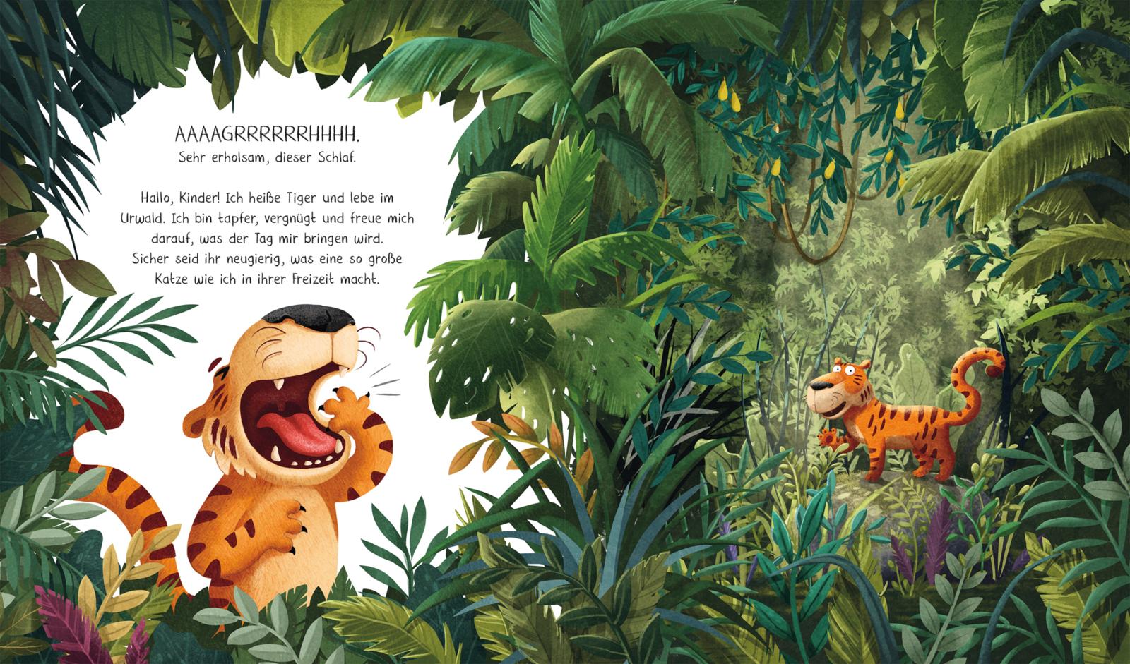 Begleite den berühmten achtsamen Tiger, wenn er des Nachts durch den Urwald schleicht. Ganz achtsam und zahm. Er schnippelt einen leckeren Obstsalat für den Baby-Elephanten und frisiert die weiße Perücke des Orang-Utans. Nach derlei Spaß wird der Achtsame Tiger gaaaanz müde, gähnt - ROAAAAR - und schlummert schließlich gemütlich ein.