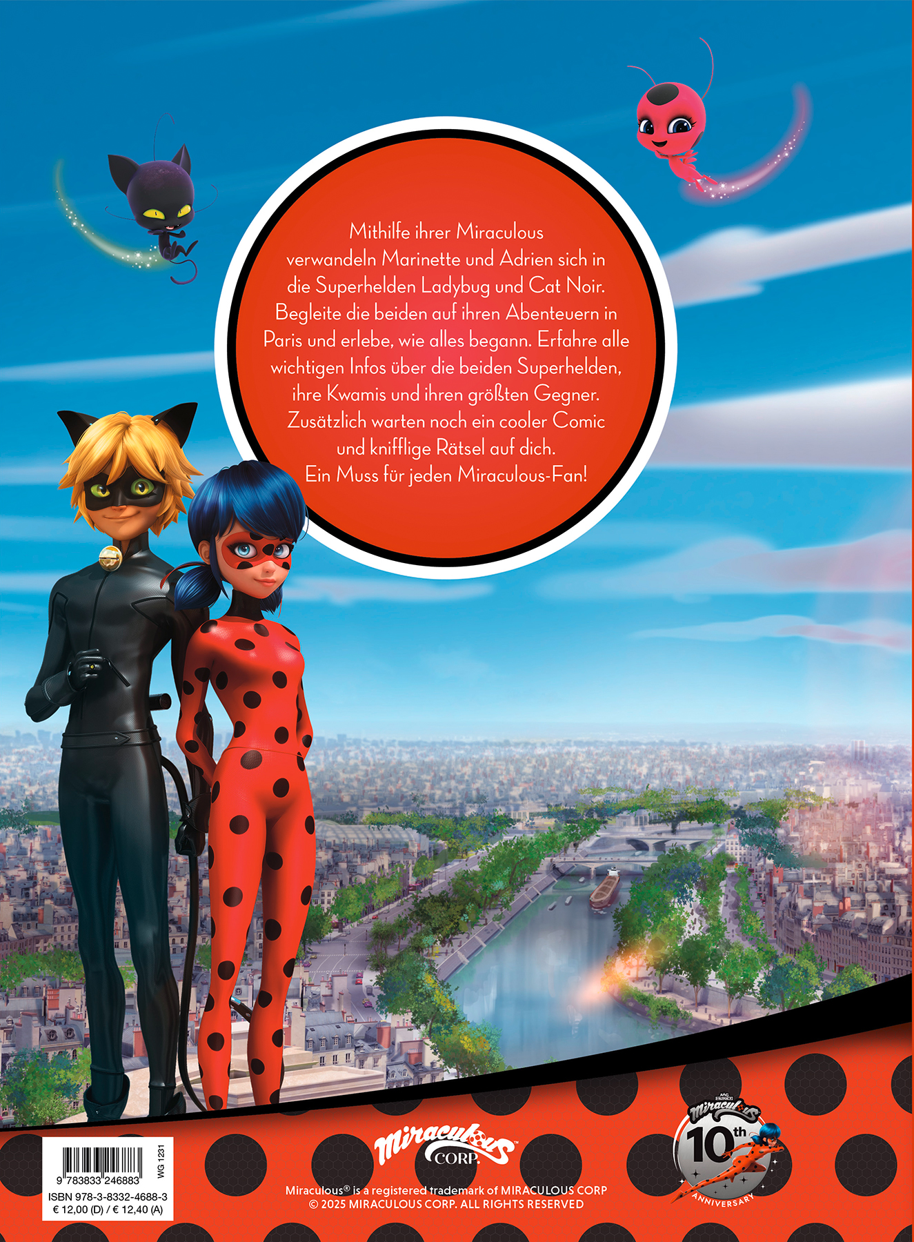 Mithilfe ihrer Miraculous verwandeln Marinette und Adrien sich in die Superhelden Ladybug und Cat Noir. Begleite die beiden auf ihren Abenteuern in Paris und erlebe, wie alles begann. Erfahre alle wichtigen Infos über die beiden Superhelden, ihre Kwamis und ihren größten Gegner. Zusätzlich warten noch ein cooler Comic und knifflige Rätsel auf dich. Ein Muss für jeden Miraculous-Fan!