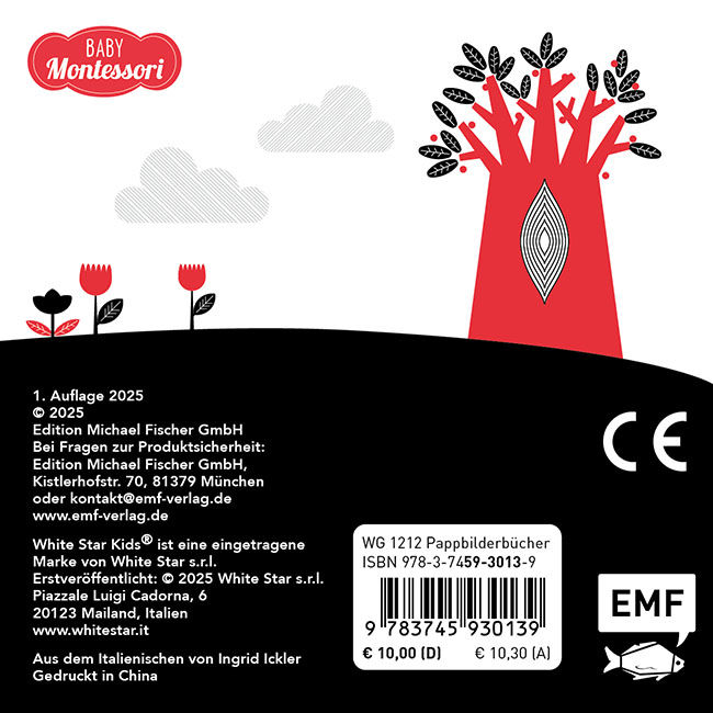 Das nach Montessori-Pädagogik in den Kontrastfarben Schwarz, Weiß und Rot illustrierte Bilderbuch ist perfekt auf das Sehvermögen von Babys abgestimmt und fördert das Wahrnehmungsvermögen der Kleinsten. Denn in den ersten Lebensmonaten kann ein Kind bereits dunkle und helle Flächen unterscheiden, ab dem dritten Lebensmonat ist Rot die erste Farbe, die erkannt wird.
