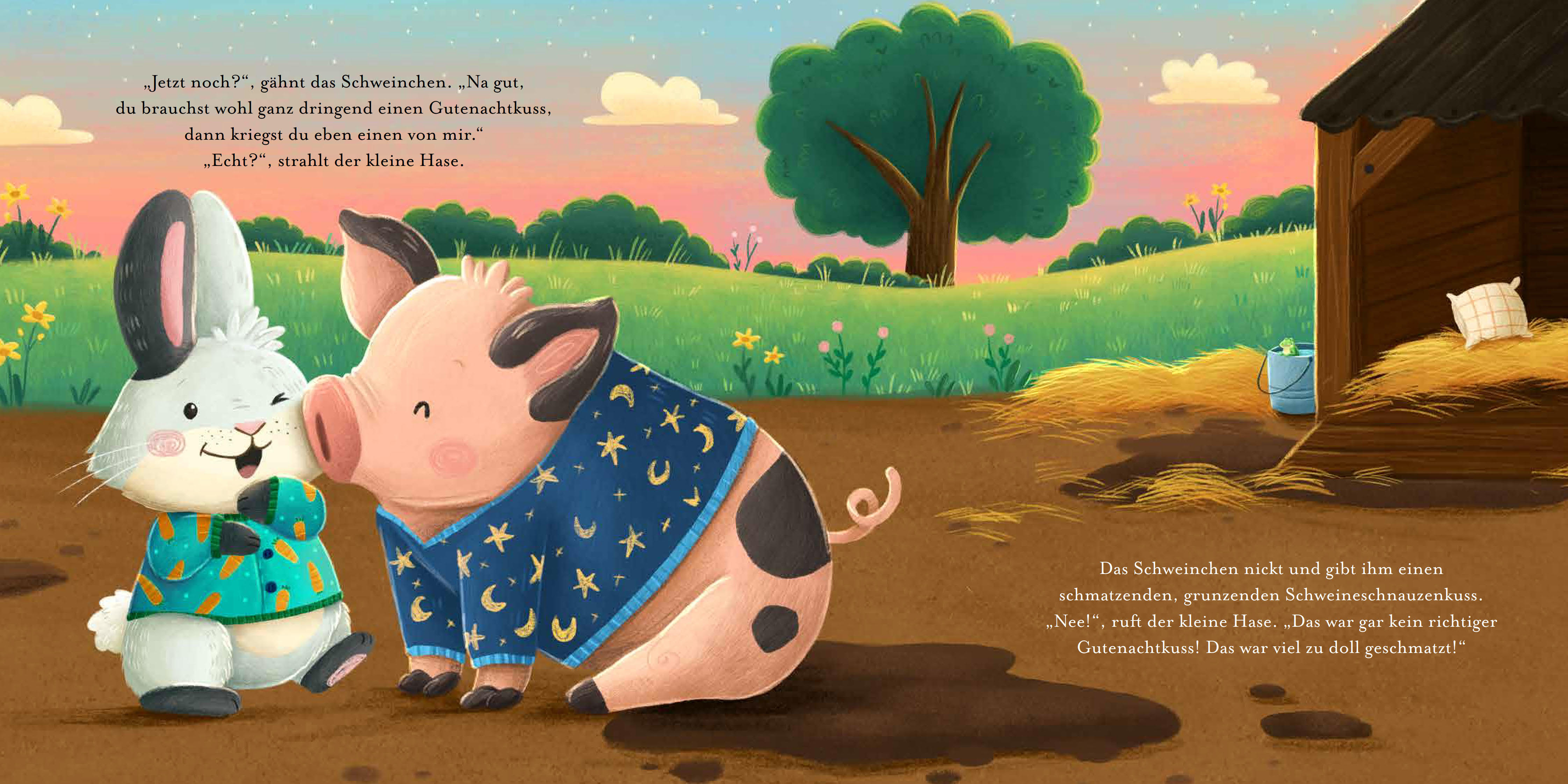 Der kleine Hase kann nicht schlafen! Obwohl seine Mama ihm schon ein Gutenachtküsschen gegeben hat, braucht er dringend noch ein zweites. Und so hüpft er einfach los und fragt seine Freunde. Doch der Schweineschnauzenkuss ist viel zu doll geschmatzt, der stachelige Igelkuss piekt, der Hundeschlabberschleckerkuss kitzelt zu doll, und der Schmetterlingskuss ist so zart, dass man ihn gar nicht merkt. Weit und breit gibt es keinen Gutenachtkuss, der dem kleinen Hasen so richtig gut gefällt. Kannst du ihm vielleicht helfen?