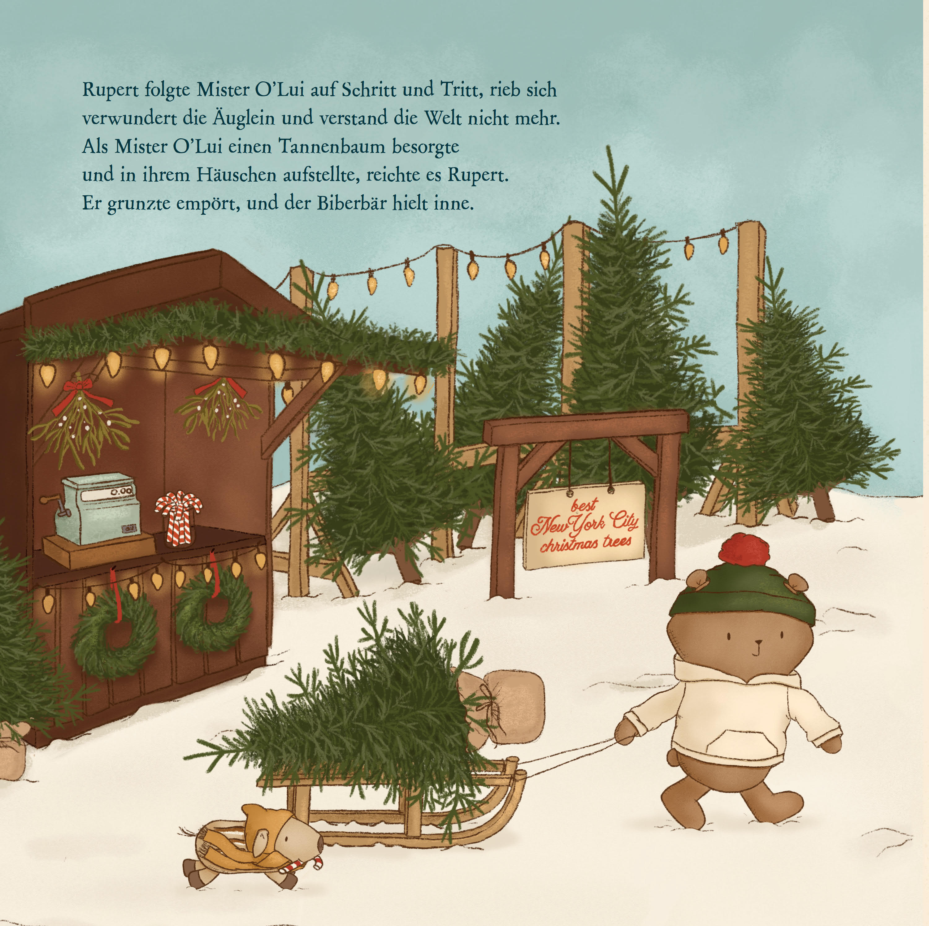 Als die ersten Schneeflocken vom Himmel fallen, beginnt Biberbär Mister O’Lui damit, das Häuschen für sich und seinen besten Freund Rupert zu schmücken. Strohsterne, Kerzen und sogar einen Tannenbaum gibt es! Rupert traut seinen Augen kaum, denn es ist sein allererstes Weihnachten. Als er erfährt, dass man dafür auch einen Wunschzettel verfasst, schreibt er eifrig einen Wunsch nach dem anderen auf. Auch Mister O’Lui steckt einen Wunsch in seinen Strumpf über dem Kamin. Doch an Weihnachten ist Mister O’Luis Strumpf leer, Rupert hingegen ist reich beschenkt worden. Das Schweinchen hat ein schlechtes Gewissen. Geht es an Weihnachten vielleicht um mehr als nur die Anzahl der Geschenke?