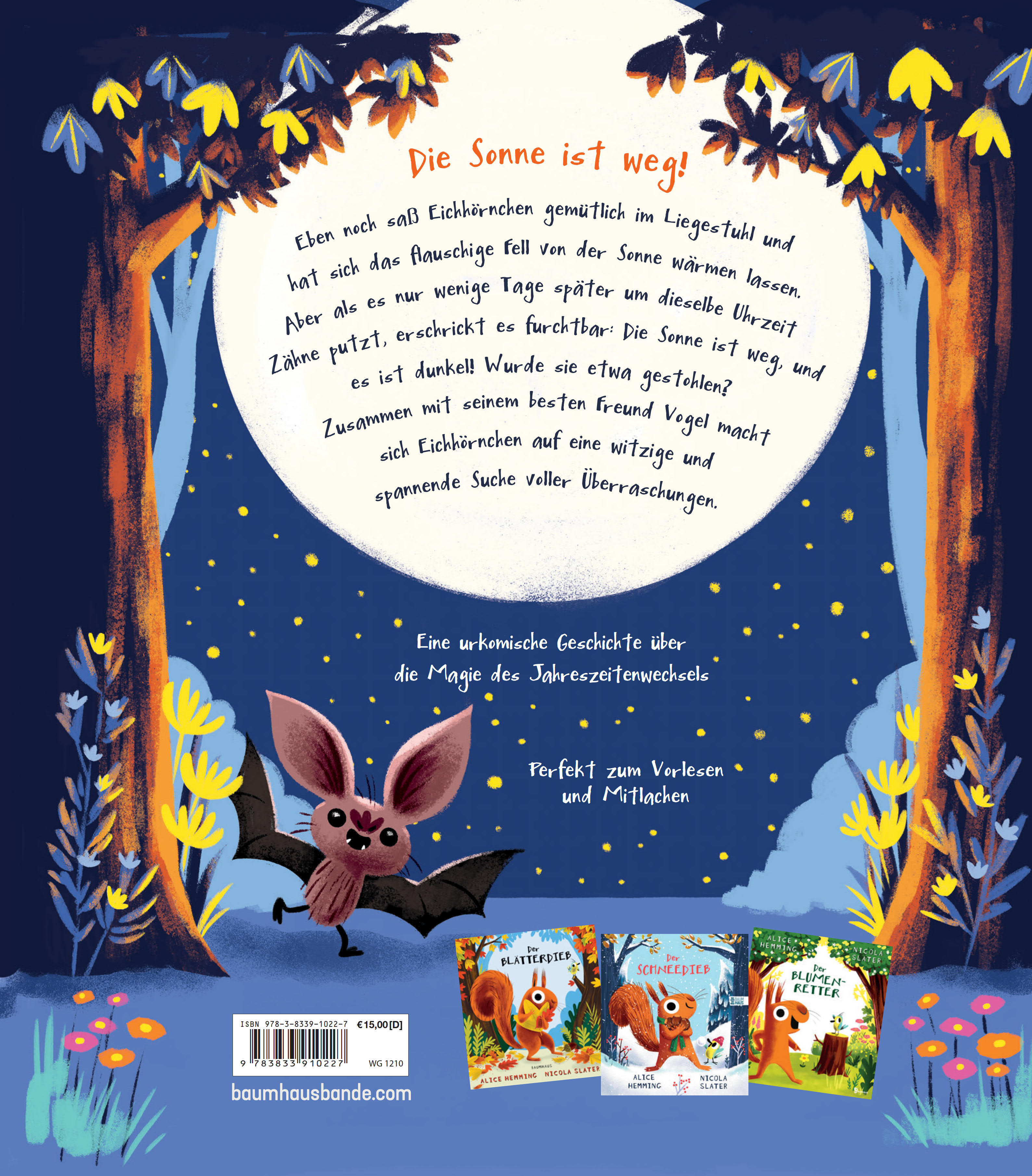 Eben noch liegt das Eichhörnchen gemütlich im Liegestuhl und lässt sich von der warmen Sonne das flauschige Fell wärmen. Doch nur wenige Tage später - zur selben Uhrzeit - erschrickt es beim Zähneputzen: Die Sonne ist weg! Es ist plötzlich dunkel. Wurde die Sonne gestohlen?