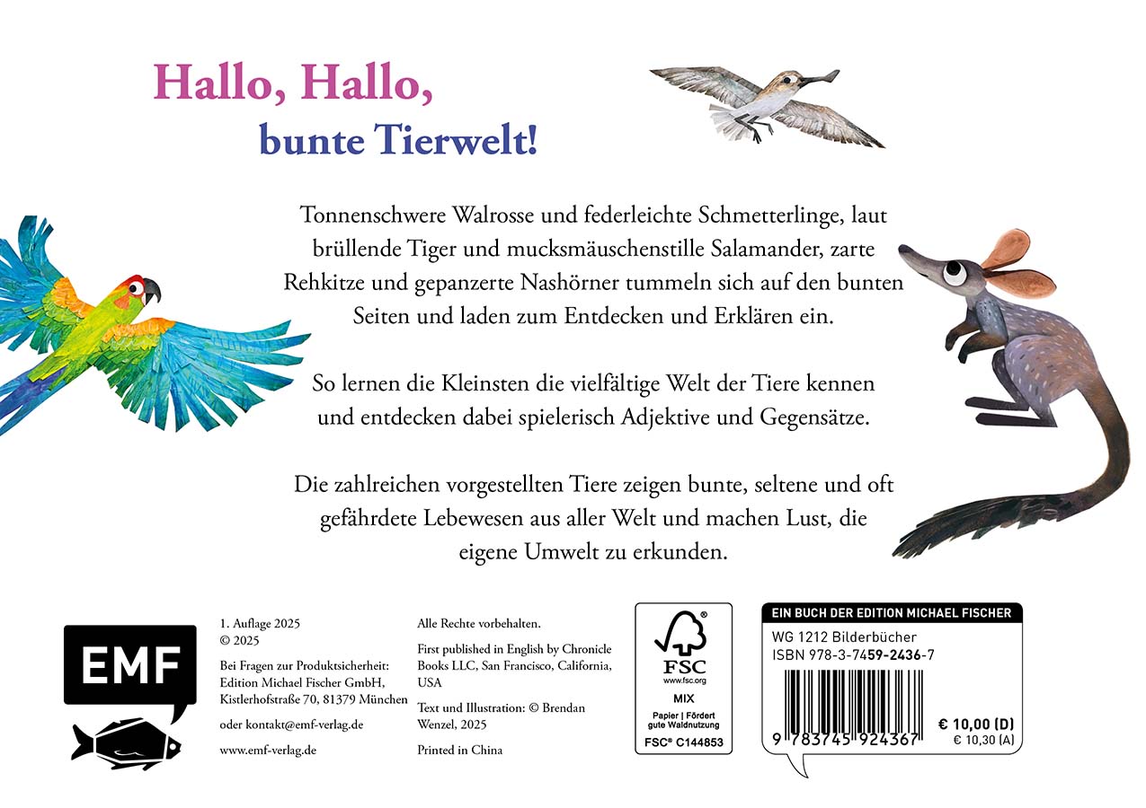 Ein buntes Buch, das mitwächst: Die lebhaft bunten Seiten bringen den Kleinsten erste Wörter, Adjektive, Gegensätze und Tiere näher. Im Nachwort des Autors werden die einzigartigen Tiere näher vorgestellt und wertvolles Sachwissen zum Thema Artenschutz vermittelt. So bietet das Buch auch älteren Kindern und Vorlesenden spannende Informationen über die vielfältige Welt der Tiere.