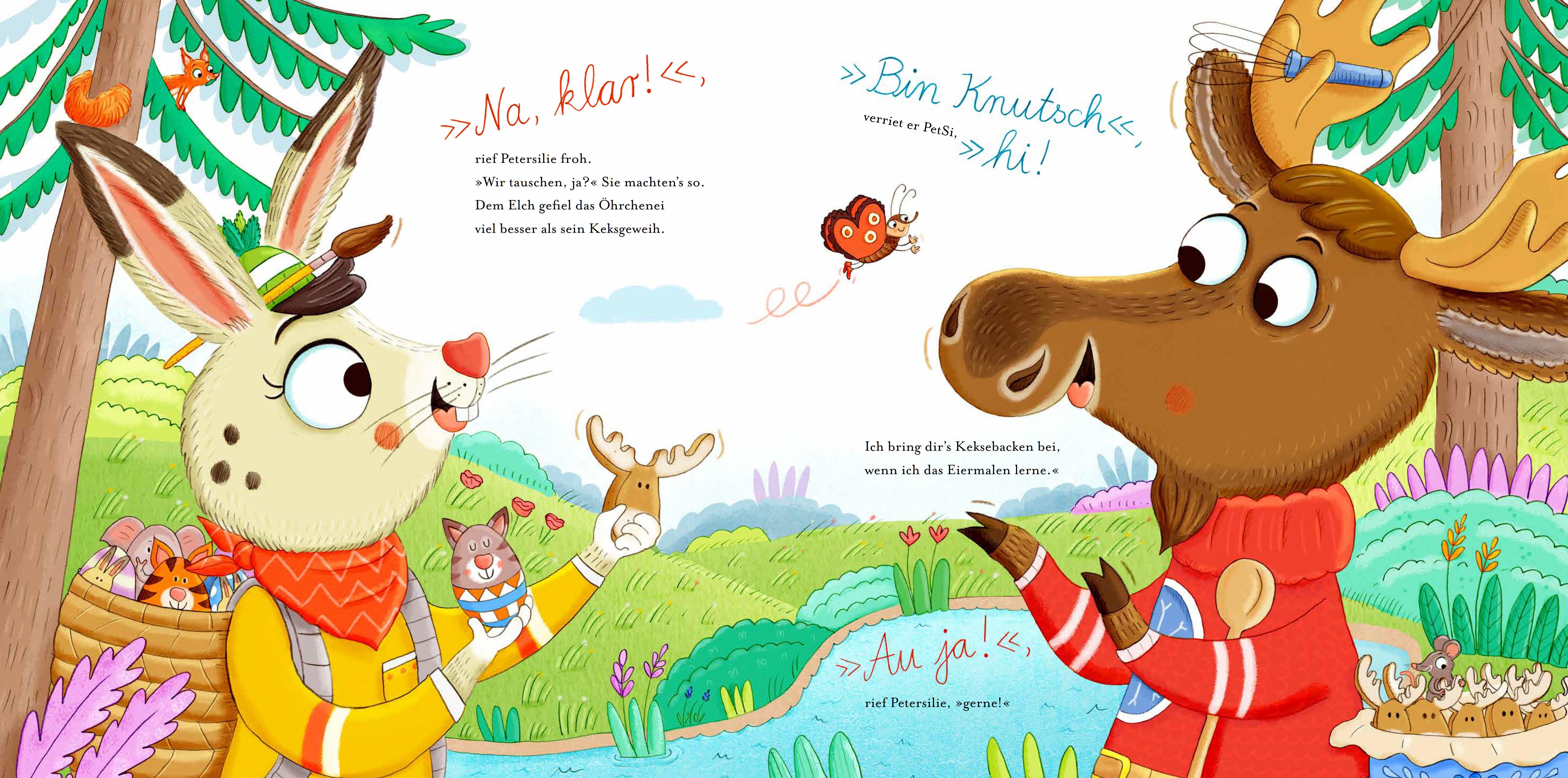 Herausgekommen ist ein fröhliches Bilderbuch über Osterelch und Weihnachtshase mit der schönen Botschaft, dass nur der glücklich ist, der seine Talente findet.
