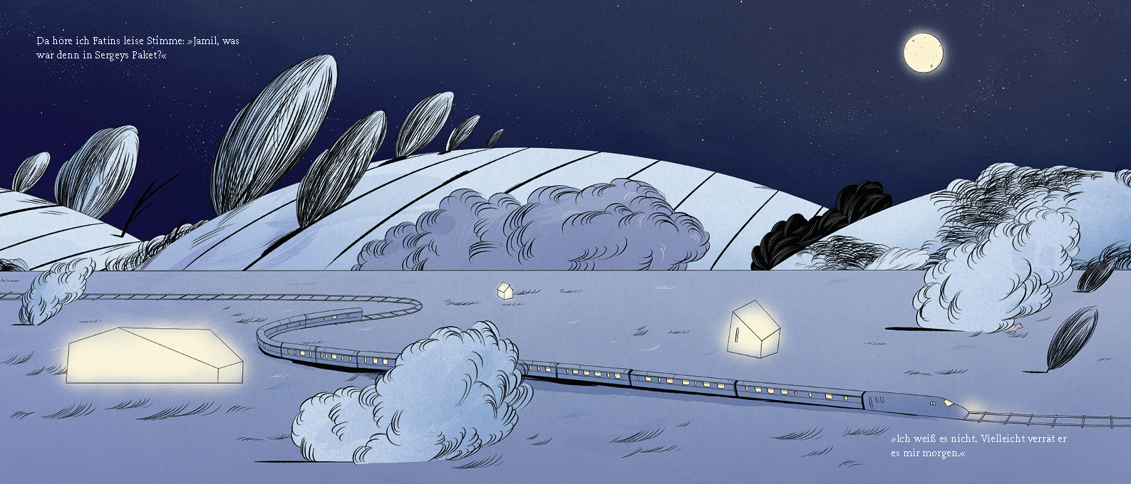 Seit Wochen fahren Jamil, sein Freund Sergey und viele andere Kinder im Zug durch das Land. Der Zug ist ihr Zuhause, hier lernen, spielen und schlafen sie, sicher und versorgt, bis die Eltern ihre zerstörten Häuser neu aufgebaut haben. Jeden Sonntag hält der Zug für wenige Minuten auf einer Brücke am Fluss, wo sich die Väter und Mütter versammeln, um ihren Kindern zu winken. Ein kurzes Wiedersehen, auf das sich alle freuen. Doch diesmal ist Sergey traurig, denn ausgerechnet heute, an seinem Geburtstag, ist sein Vater nicht zu sehen! Doch der hat sich eine besondere Überraschung für seinen Sohn ausgedacht. Andrea Hensgen erschafft mit ihrer Zuggeschichte ein starkes Bild für Unbehaustheit in Zeiten des Krieges und erzählt gleichzeitig von Menschlichkeit und Zuversicht. Hannah Brückner vermittelt mit feinen Illustrationen in warmen, lichten Farben das erstaunliche Gefühl von Geborgenheit an einem ungewöhnlichen Ort.