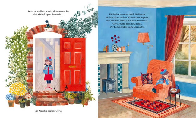 Olivia wohnt im Haus mit der kleinen roten Tür. Dort ist es still und auch etwas einsam. Maus wohnt in einem großen alten Baum, ganz hinten im Garten. Sie hätte gern jemanden zum Reden. In einem Schneesturm bricht der alte Baum krachend zusammen. Olivia versucht, für ihre kleine Nachbarin ein neues Zuhause zu finden. Könnte es eine Teekanne oder eine Kuckucksuhr sein? Nein, darin fühlt sich Maus nicht wohl. Erst als Olivia ihrer neuen kleinen Freundin ein Plätzchen in ihrem großen Haus anbietet, fühlt es sich für beide an wie ein richtiges Zuhause.