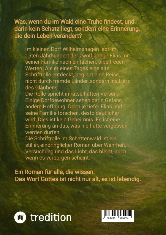 Die Schriftrolle im Schattenwald ist ein geistlich tiefgehender Roman über die Kraft des biblischen Wortes, die geistliche Reife eines suchenden Jungen und die stille Wirksamkeit Gottes inmitten von Alltag, Zweifel und Verführung.Die Geschichte spielt in einem kleinen, abgeschiedenen Dorf im 15. Jahrhundert. In dieser ländlichen Welt, in der das Leben einfach, aber von echtem Glauben geprägt ist, lebt Elias - ein 12-jähriger Junge mit vielen Fragen. Er wächst in einer gläubigen Familie auf, lernt das Gebet, kennt die Bibelverse - und doch merkt er, dass es mehr geben muss als bloße Worte. Als er eines Tages im nahegelegenen Schattenwald eine alte, unscheinbare Truhe entdeckt, beginnt eine Reise, die sein Leben verändern wird.Die Truhe enthält eine geheimnisvolle Schriftrolle - geschrieben in einer seltsam vertrauten Sprache. Sie enthält keine neue Offenbarung, sondern verschlüsselte Fragmente biblischer Wahrheit: Verse, Psalmen, Zeugnisse - aufbewahrt von verfolgten Christen, die Gottes Wort nicht verlieren wollten. Doch während Elias und seine Familie nach und nach die Bedeutung der Rolle entschlüsseln, beginnt das Dorf sich zu spalten. Es gibt jene, die prüfen - und jene, die fürchten. Und es gibt einen Satz, der alles ins Wanken bringt: ein Vers, der sich biblisch anfühlt, aber nicht aus der Schrift stammt...Was als kindliche Neugier beginnt, wird für Elias zu einem geistlichen Reifungsweg. Er lernt, dass nicht jedes Licht von Gott ist - und dass Wahrheit nicht immer bequem, aber immer rettend ist. Ohne übernatürliche Effekte, ohne Magie oder Spektakel erzählt Die Schriftrolle im Schattenwald davon, wie Christus erkannt wird - nicht durch Gefühle, sondern durch das Wort.Ein Roman, der nicht nur unterhält, sondern zurückführt.Zur Schrift. Zur Wahrheit. Zu Jesus Christus.