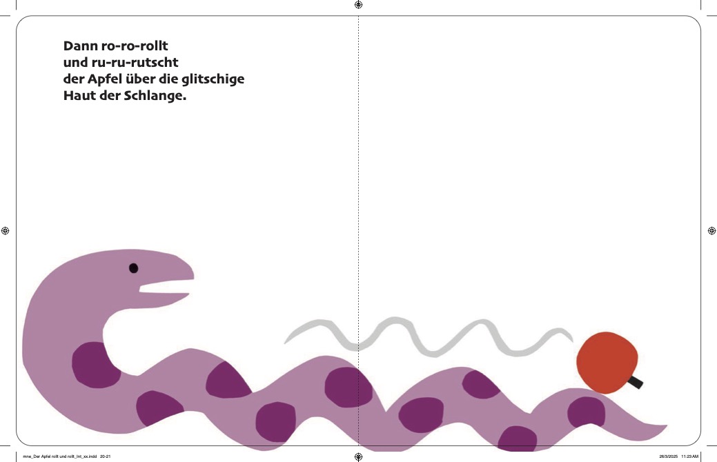 Der Elefant will den Apfel vom Baum pflücken, aber er fällt ihm vom Rüssel undkullert dann von Tier zu Tier. Zuerst rutscht er den Hals der Giraffe hinunter, landetdann auf den Höckern des Kamels, rollt über den Rücken des Nilpferds, desKrokodils, des Affen und des Flamingos, bis er schließlich bei dem kleinen Jungenlandet. Kann er den Apfel auffangen?- Mit Lautmalereien, die zum Mitsprechen anregen- Fördert die Sprachentwicklung- Klare, einfache Formen- Kennenlernen verschiedener Tiere- Erstes Vorlesen für Kinder ab 18 Monaten