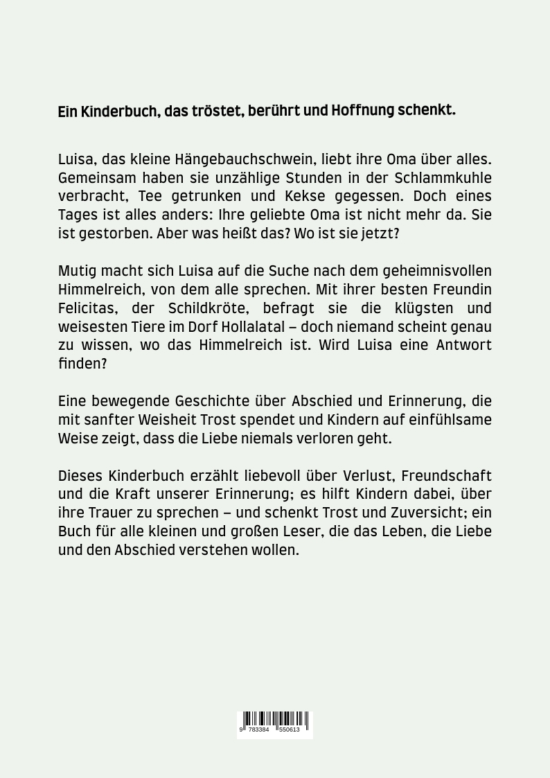 Luisa, das kleine Hängebauchschwein, liebt ihre Oma über alles. Gemeinsam haben sie unzählige Stunden in der Schlammkuhle verbracht, Tee getrunken und Kekse gegessen. Doch eines Tages ist alles anders: Ihre geliebte Oma ist nicht mehr da. Sie ist gestorben. Aber was heißt das? Wo ist sie jetzt? Mutig macht sich Luisa auf die Suche nach dem geheimnisvollen Himmelreich, von dem alle sprechen. Mit ihrer besten Freundin Felicitas, der Schildkröte, befragt sie die klügsten und weisesten Tiere im Dorf Hollalatal - doch niemand scheint genau zu wissen, wo das Himmelreich ist. Wird Luisa eine Antwort finden? Eine bewegende Geschichte über Abschied und Erinnerung, die mit sanfter Weisheit Trost spendet und Kindern auf einfühlsame Weise zeigt, dass die Liebe niemals verloren geht.Dieses Kinderbuch erzählt liebevoll über Verlust, Freundschaft und die Kraft unserer Erinnerung; es hilft Kindern dabei, über ihre Trauer zu sprechen - und schenkt Trost und Zuversicht; ein Buch für alle kleinen und großen Leser, die das Leben, die Liebe und den Abschied verstehen wollen.