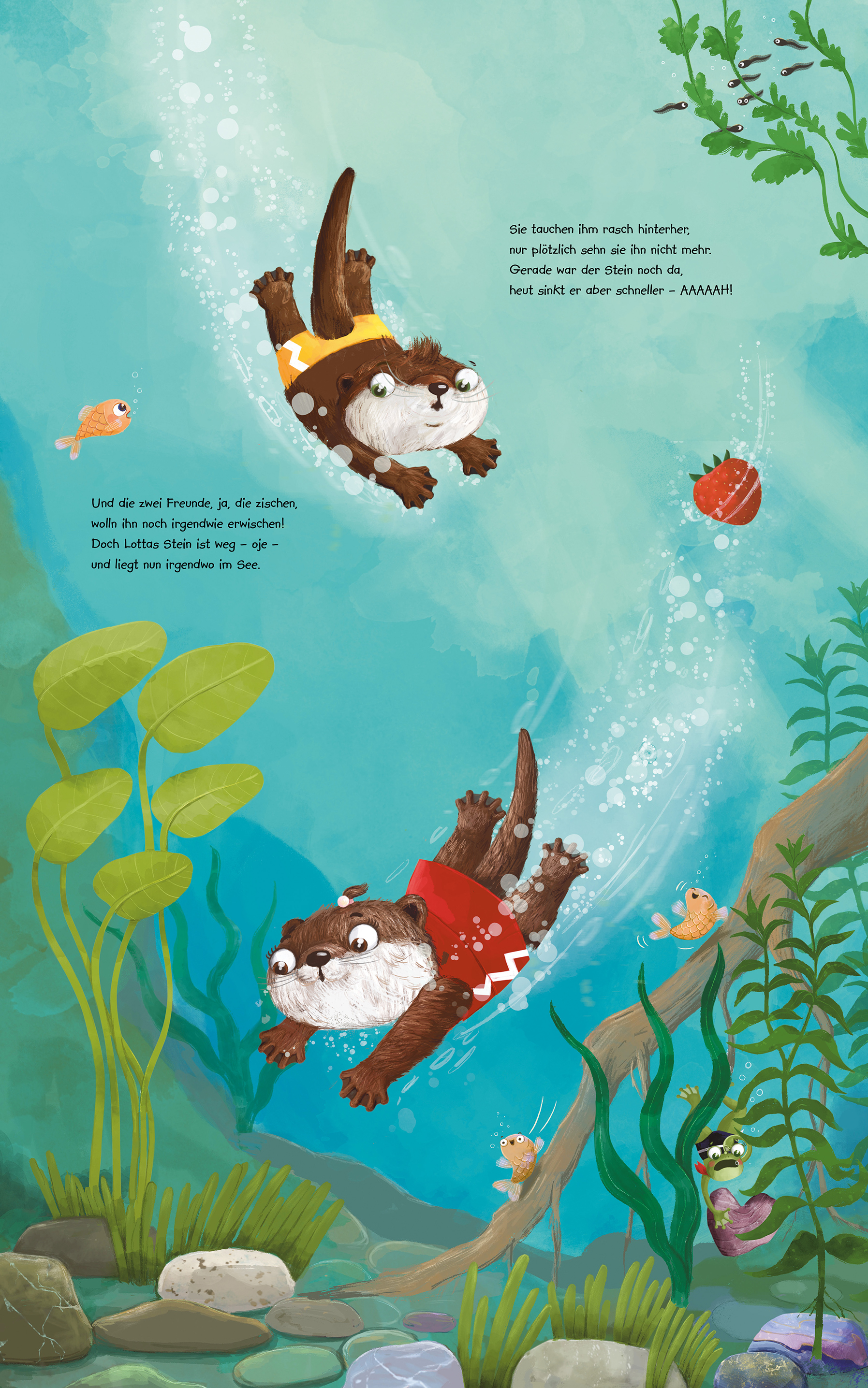 Zwischen Wurzelpfaden im Wald und Sommerwiesen am plätschernden Bach findet das Ottermädchen Lotta manch tollen Stein. Gemeinsam mit ihrem Freund Konstantin liebt sie es, nach dem Sammeln mit den schönsten Steinen zu spielen. Am liebsten bei den Rutschen am See – dort jagen die beiden Otter Lottas Glücksstein, ihrem Herzensstück, hinterher. Doch was passiert, wenn sie ihren Lieblingsstein nicht mehr finden?