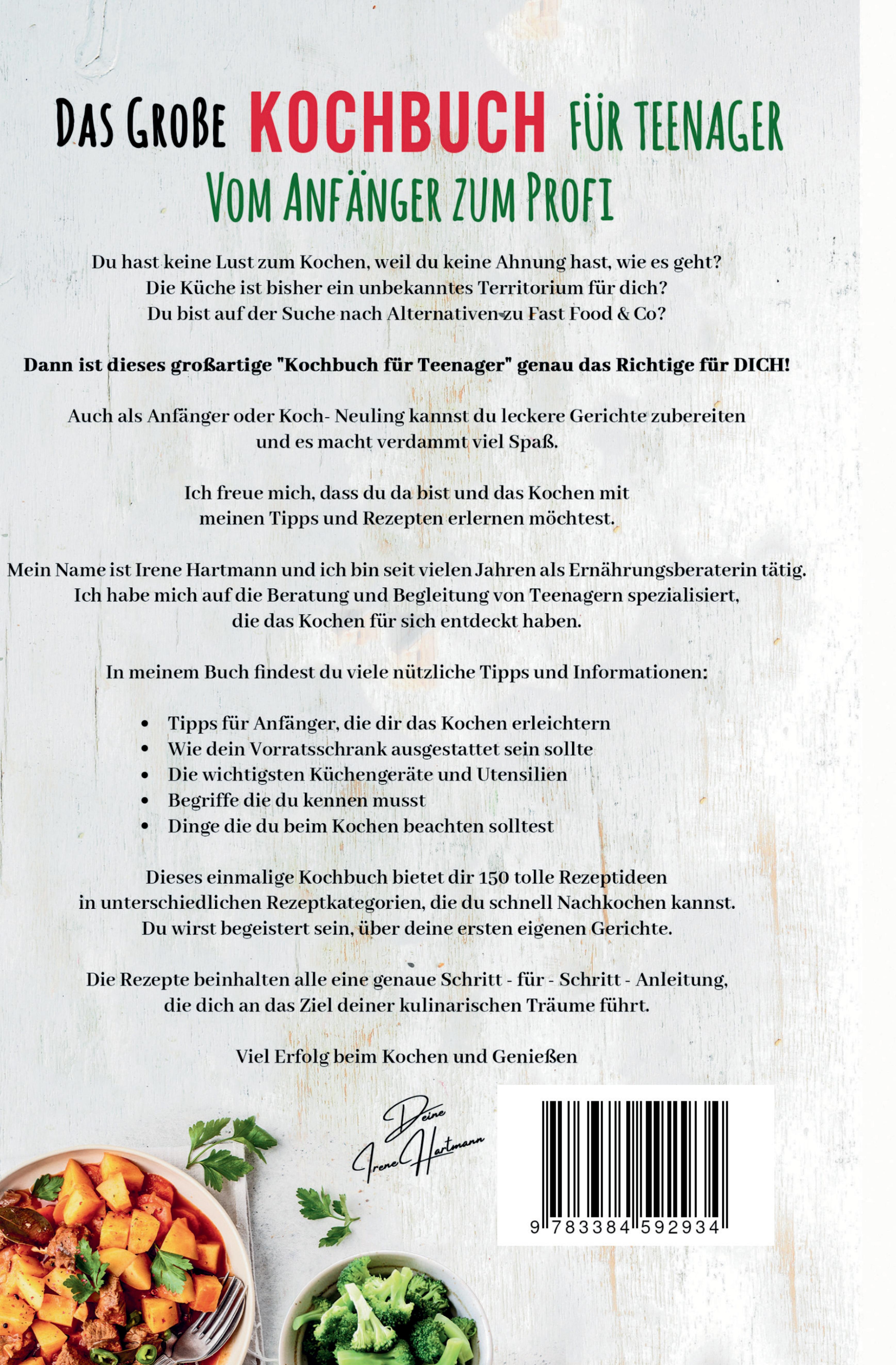 Das große Kochbuch für Teenager: Der perfekte Einstieg in die Welt des Kochens - einfach, lecker, alltagstauglich.Du willst endlich selbst kochen, suchst nach gesunden Alternativen zu Fast Food oder möchtest lernen, wie man mit wenig Aufwand richtig leckere Gerichte zaubert? Dann ist dieses Buch genau das Richtige für dich!"Das große Kochbuch für Teenager" ist dein idealer Begleiter, wenn du deine ersten Schritte in der Küche machst - egal ob du absoluter Neuling bist oder einfach neue Ideen suchst. Mit 150 abwechslungsreichen Rezepten aus verschiedenen Kategorien lernst du, wie einfach und kreativ Kochen sein kann.Ernährungsberaterin Irene Hartmann, spezialisiert auf Jugendliche, zeigt dir Schritt für Schritt, worauf es ankommt:- Welche Grundausstattung du brauchst- Wie du Zutaten clever kombinierst- Und wie du gesunde Gerichte ganz easy selbst zubereitestWas dich erwartet:- 150 einfache & leckere Rezepte - perfekt für Schule, Freizeit & Familie- Step-by-Step-Anleitungen, die garantiert gelingen- Nährwertangaben & Zubereitungszeiten für jedes Gericht- Praktische Tipps & Ratgeberteil: Vorratsliste, Küchenbasics, Hygiene, Nachhaltigkeit- Perfekt für Anfänger - ganz ohne VorkenntnisseOb du morgens Energie tanken willst, mittags etwas Schnelles brauchst oder abends mit Freunden etwas auf den Tisch zaubern willst - dieses Buch liefert dir die Ideen, das Wissen und die Motivation, um selbstbewusst zu kochen.Starte jetzt dein Küchenabenteuer und entdecke, wie viel Spaß gesundes Kochen machen kann - ganz einfach, Schritt für Schritt!