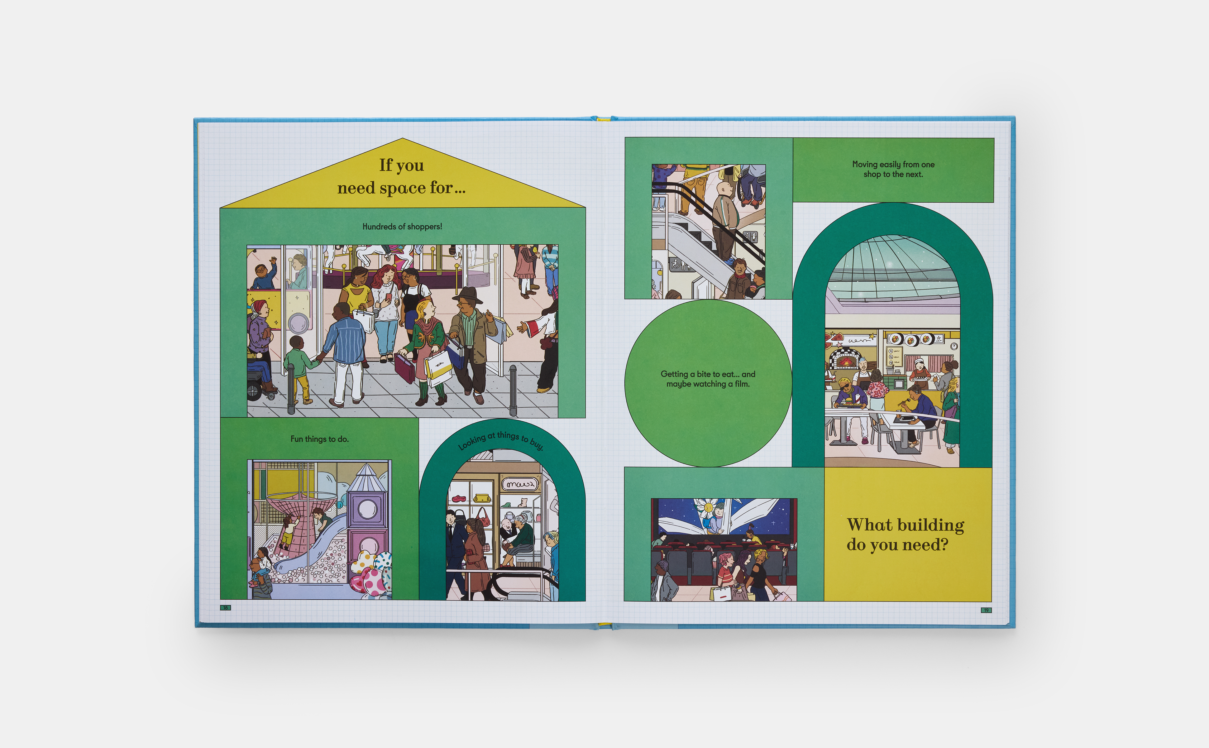 In this interactive first book of architecture, children discover how architects design everyday buildings, from planetariums, aquariums, and airports to supermarkets and shopping malls, so that they best meet their users’ needs. Set up as a guessing game, the book presents clues that invite readers to guess which type of building is needed in 10 different scenarios. For example, what building do you need for students, teachers, and learning about science, history, and art? A school! Children continue the fun by looking for the hidden architect on each spread.