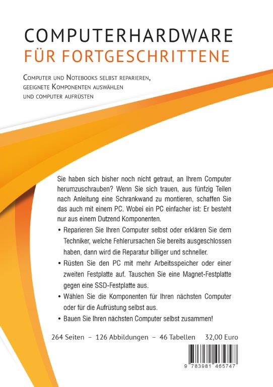 Das Buch enthält einige Anleitungen, wie man den Arbeitsspeicher aufrüstet, ein defektes DVD-Laufwerk auswechselt, eine Festplatte einbaut und PC oder Notebook reinigt. Das sind einfache Tätigkeiten, dafür braucht man kein handwerkliches Geschick. Auf Reparaturanleitungen für Smartphone oder Tablet habe ich verzichtet, es gibt zu viele Modelle und Ersatzteile sind ohnehin nicht zu bekommen. Für die meisten Smartphones und Tablets gibt es Anleitungen auf YouTube. Kompliziertere Anleitungen, wie man seinen PC repariert, modernisiert oder einen eigenen PC komplett selbst zusammenschraubt, finden Sie in meinem Buch "Computerhardware für Fortgeschrittene".