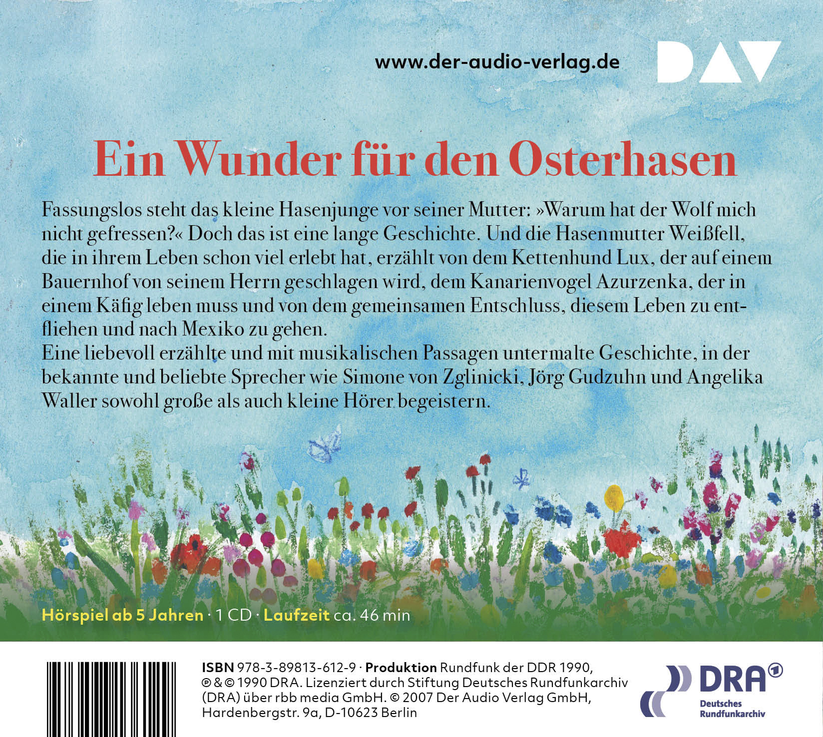 Ein Wunder für den Osterhasen! Fassungslos steht das kleine Hasenjunge vor seiner Mutter: "Warum hat der Wolf mich nicht gefressen?" Das ist eine lange Geschichte. Eine liebevoll erzählte, mit musikalischen Passagen und herrlichen Titelrollen inszenierte Geschichte zu Ostern, in der Simone von Zglinicki als Weißfell, Jörg Gudzuhn als Lux und Angelika Waller als Kanarienvogel Azurzenka begeistern.
