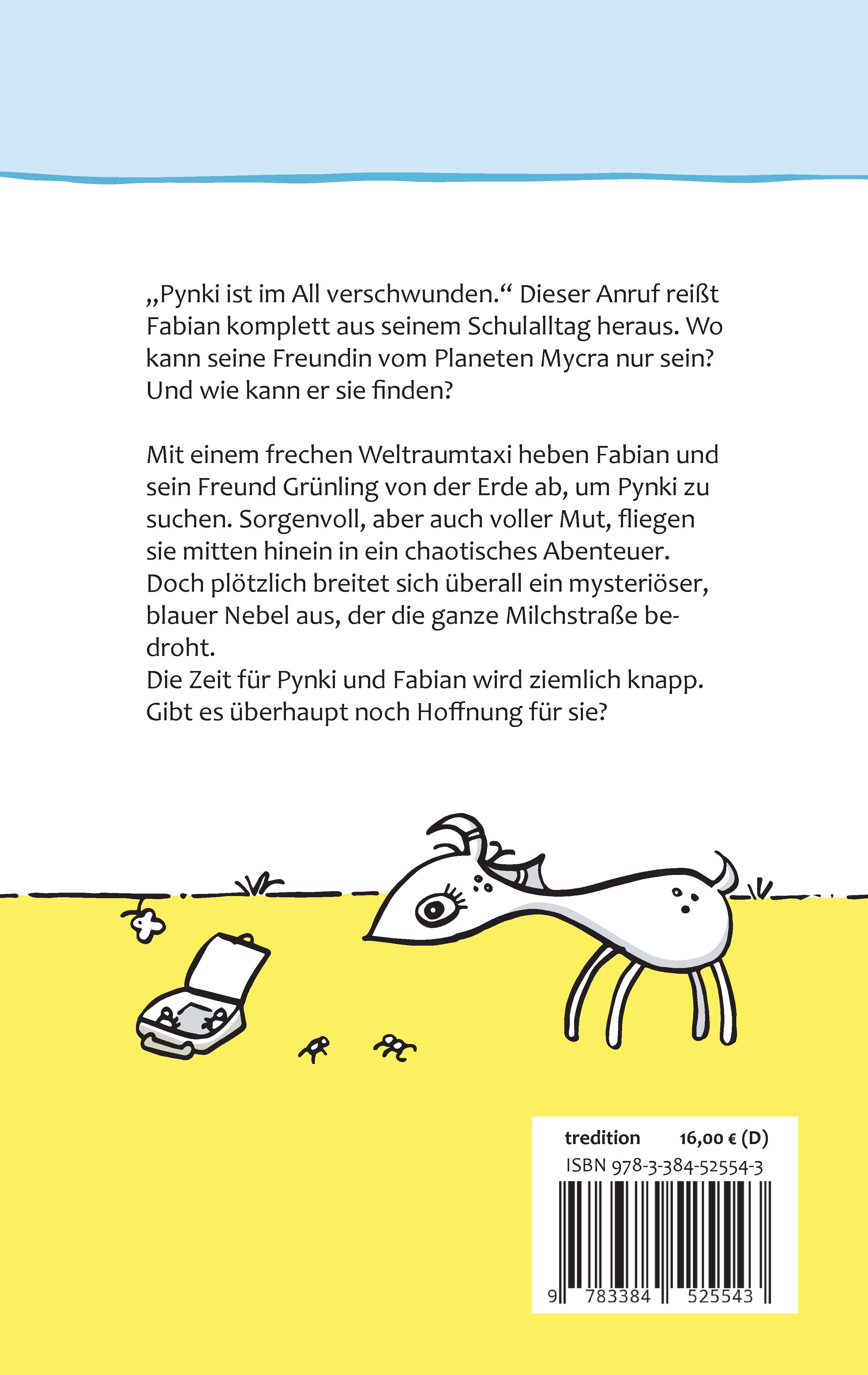 "Flüpterikse im All" ist ein Kinderbuch ab 10 Jahren. Auf 380 Seiten erleben die beiden 14-jährigen Protagonisten Pynki und Fabian ein buntes Weltraumabenteuer. Sechs liebevoll gezeichnete Illustrationen sind im Text enthalten.Worum geht es?"Pynki ist im All verschwunden." Dieser Anruf reißt Fabian komplett aus seinem Schulalltag heraus. Wo kann seine Freundin vom Planeten Mycra nur sein? Und wie kann er sie finden? Mit einem frechen Weltraumtaxi heben Fabian und sein Freund Grünling von der Erde ab, um Pynki zu suchen. Sorgenvoll, aber auch voller Mut, fliegen sie mitten hinein in ein chaotisches Abenteuer. Doch plötzlich breitet sich überall ein mysteriöser, blauer Nebel aus, der die ganze Milchstraße bedroht. Die Zeit für Pynki und Fabian wird ziemlich knapp. Gibt es überhaupt noch Hoffnung für sie?Ungewissheit, Verzweiflung, Angst, Hoffnung, Freundschaft, Liebe, Mut, Glück und Albernheiten, viele Gefühle sind in der Geschichte enthalten. Den beiden Hauptfiguren begegnen auf ihrer Reise durch die Milchstraße seltsame, schusselige, gefährliche und vor allem ungewöhnliche Außerirdische.