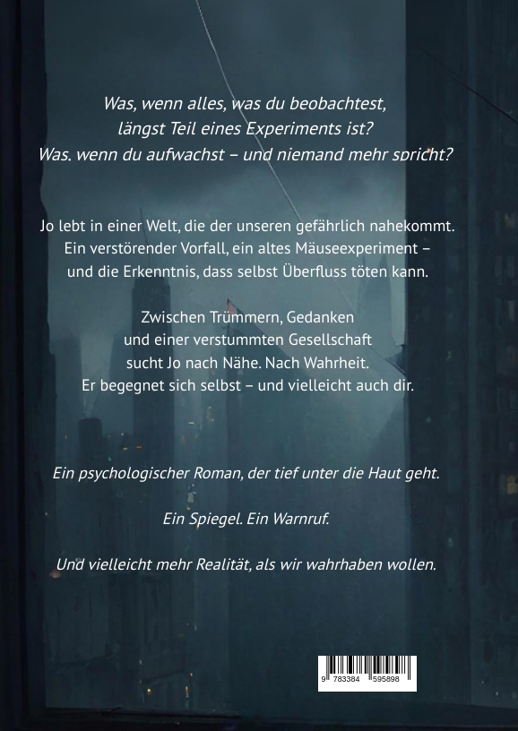 | Schlagworte | Beobachtung & Wahnsinn • Digitale Einsamkeit • Dystopie ohne Zukunft • Gesellschaftskritik • Innerer Monolog • Menschlichkeit • Psychologischer Roman • Realität vs. Illusion • soziale Kälte • Universum 25 |