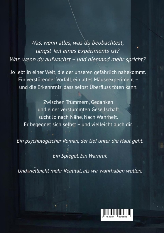 | Schlagworte | Beobachtung & Wahnsinn • Digitale Einsamkeit • Dystopie ohne Zukunft • Gesellschaftskritik • Innerer Monolog • Menschlichkeit • Psychologischer Roman • Realität vs. Illusion • soziale Kälte • Universum 25 |