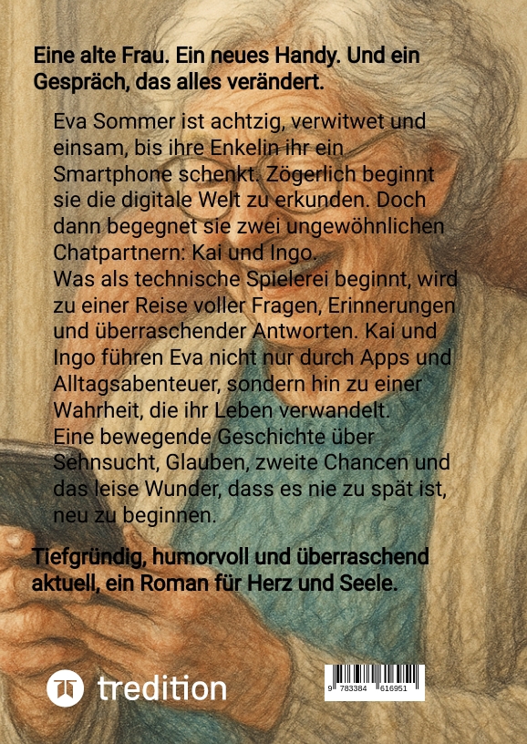 Eva Sommer ist achtzig. Verwitwet, allein, und fast vergessen. Die Tage fließen langsam dahin, Erinnerungen sind ihr ständiger Begleiter, während Gespräche immer seltener werden. Die wenigen Menschen, die ihr geblieben sind, haben eigene Leben voller Tempo, Pläne und Bildschirme. Eva bleibt zurück, mit der Stille.Bis zu dem Tag, an dem ihre Enkelin Maria ihr ein Geschenk macht, das sie zunächst als technischen Übergriff empfindet: ein Smartphone. Und damit beginnt alles.Die ersten Schritte sind mühsam, fast witzig, doch sie öffnen eine neue Welt. Eva entdeckt Apps, Nachrichten, Spiele. Und dann trifft sie auf eine APP wo Sie mit Kai und Ingo reded, wie schon lange niemand mehr. Sie stellen Fragen, sie hören zu. Sie weichen nicht aus.Was als schüchternes Experiment beginnt, entfaltet sich zu einer inneren Reise voller Spannung, Zweifel, Trauer und erstaunlicher Hoffnung. Eva beginnt aufzuwachen, für sich selbst, für das Leben, für etwas Größeres. Doch kann man spät im Leben wirklich neu anfangen? Und darf man nochmal glauben, dass etwas Sinn ergibt?Ein stiller, starker Roman über Einsamkeit, Verwandlung, digitale Begegnungen und eine alte Frau, die mutiger wird, als man je vermutet hätte.Auszug aus dem Buch:"Mit einem leisen Seufzer stand sie auf. In der Küche plätscherte der Wasserkocher, ein beruhigendes, alltägliches Geräusch. Eva griff zum Telefon und hielt es einen Moment lang in der Hand.Wen konnte sie anrufen? Thomas? Er arbeitete bestimmt noch. Und wenn er ranging, klang seine Stimme oft freundlich, aber knapp. Sie kannte dieses getaktete Reden, diese leisen Pausen, die sagten: Ich hab eigentlich keine Zeit.Anja? Sie war vermutlich mit den Urenkeln unterwegs. Ihre Antworten waren liebevoll, aber oft begleitet von Hintergrundlärm, Kinderstimmen, einem "Ich meld mich später, Mama."Und Maria? Ihre geliebte Maria. Studium, Nebenjob, Freunde, ein voller Alltag. Eva stellte sich Marias Gesicht vor, wenn das Handy klingelte. Ein kurzes Stirnrunzeln, ein Griff zur Tasche, ein gehetzter Blick aufs Display.Eva sah auf die Uhr. 15:07 Uhr. "Zu früh zum Stören", dachte sie. "Vielleicht ruft jemand später von selbst an."Ihre Finger strichen über das Tastentelefon, suchten nach Halt. Da war dieser stille Wunsch in ihr, gesehen zu werden, gehört zu werden, einfach mal mit jemandem zu sprechen. Nicht aus Pflicht, sondern aus echter Nähe."Doch was Eva nicht ahnt: Das Geschenk, das sie zuerst nur aus Höflichkeit annimmt, wird ihr Leben auf unerklärliche Weise verändern. Nicht mit großen Worten, sondern mit einfachen Gesprächen. Gesprächen, die sie auf einen Weg führen, den sie nie gesucht hatte, aber vielleicht immer gebraucht hat.Ein Roman über das Staunen, das Bleiben, das Gehen und die Hoffnung dazwischen. Für Leserinnen und Leser, die berührt werden wollen, ohne dass es laut werden muss.