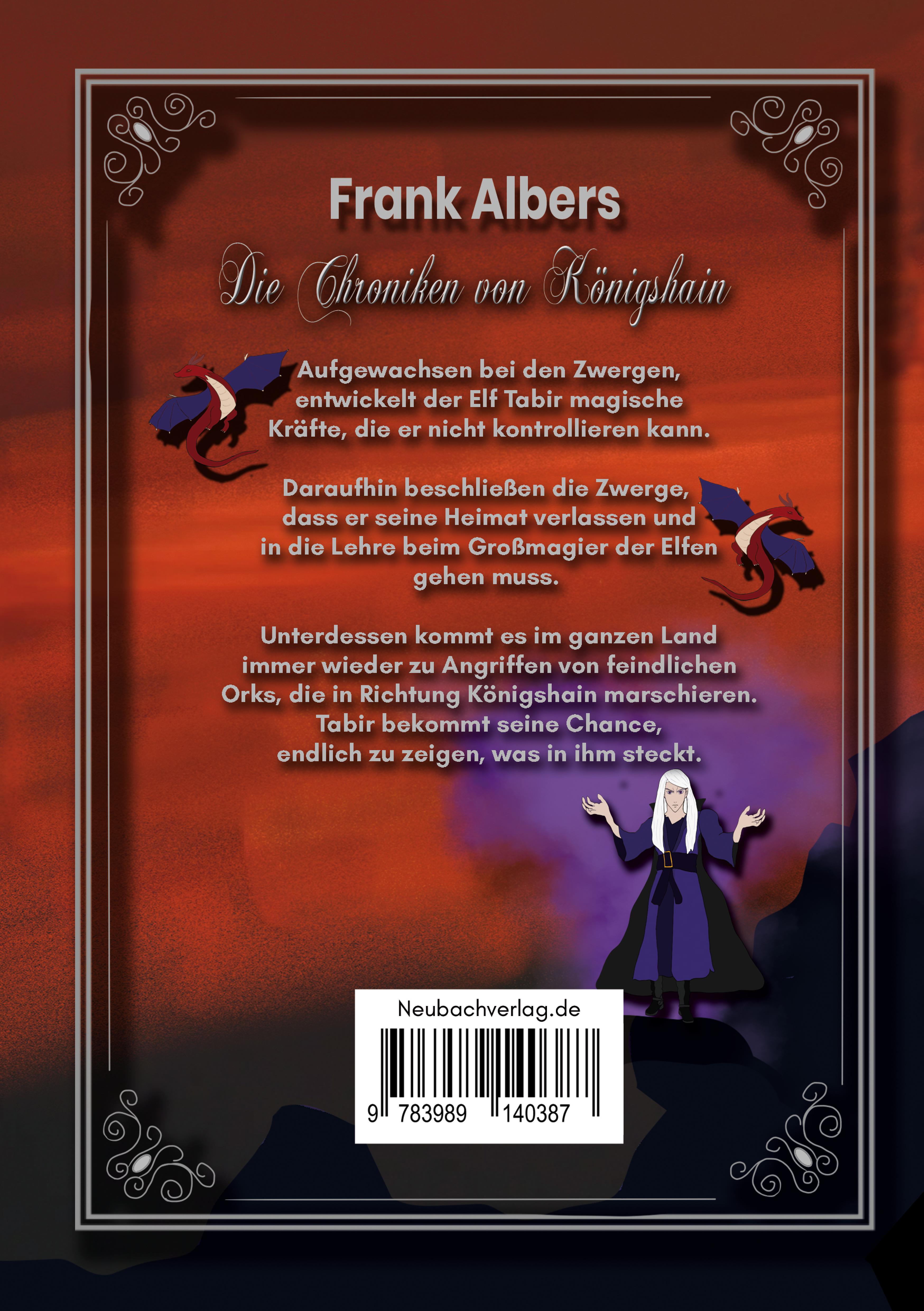 Aufgewachsen bei den Zwergen, entwickelt der Elf Tabir magische Kräfte, die er nicht kontrollieren kann. Daraufhin beschließen die Zwerge, dass er seine Heimat verlassen und in die Lehre beim Großmagier der Elfen gehen muss. Unterdessen kommt es im ganzen Land immer wieder zu Angriffen von feindlichen Orks, die in Richtung Königshain marschieren. Tabir bekommt seine Chance, endlich zu zeigen, was in ihm steckt.Ein spannender Fantasyroman für Kinder- und Jugendliche ab 10 Jahre.