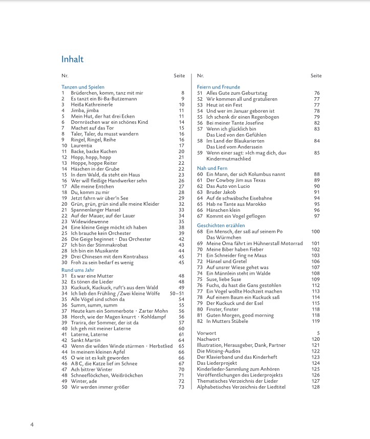 Kinder singen gern – zu Hause, im Kindergarten, in der Schule, beim Spielen, beim Laternenlaufen. Bewegungslieder bringen Schwung in den Tag, Quatschlieder und Zungenbrecher sorgen schnell für gute Laune, Schlaflieder bringen zur Ruhe. Lieder erzählen Geschichten, sie gliedern den Tag und das Jahr, sie gehören zu Festen einfach dazu.