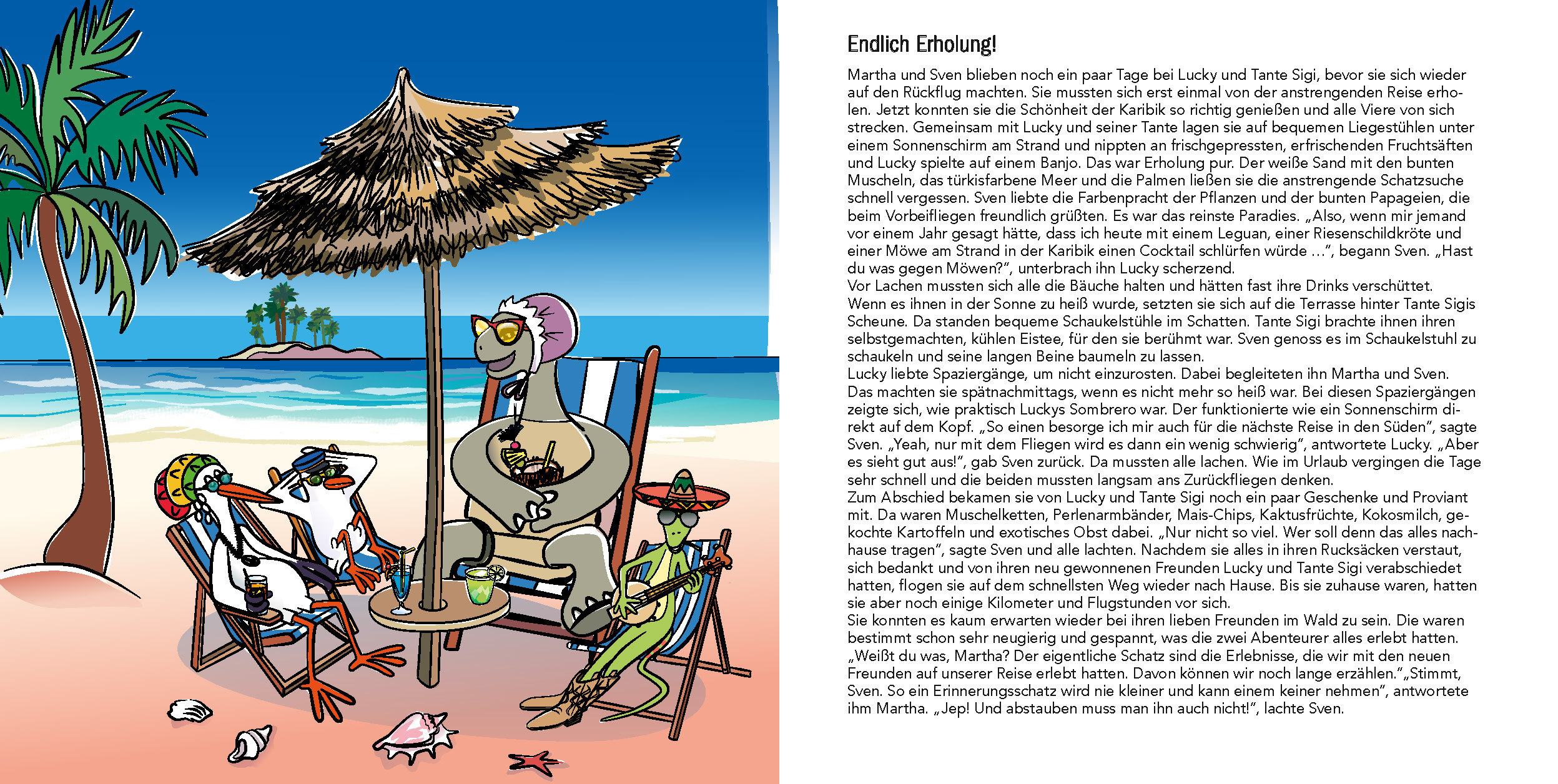 Ein ungleiches Team sind die beiden ja schon. Martha Möwe und Sven Storch. Als sie eine Schatzkarte von Captain Schmuddelbart finden, machen sie sich gemeinsam auf eine Schatzsuche in die Karibik. Werden sie den Schatz finden oder war am Ende der Pirat Flitzekacke - der nämlich ein besonders Flotter ist - schneller? Auf ihrer Abenteuerreise lernen sie viele Länder, Tiere und neue Freunde kennen. Unterwegs sind sie immer wieder auf Hilfe angewiesen. Glücklicherweise treffen sie Lucky Leguan und seine Tante Sigi, eine mehrere hundert Jahre alte Schildkröte.