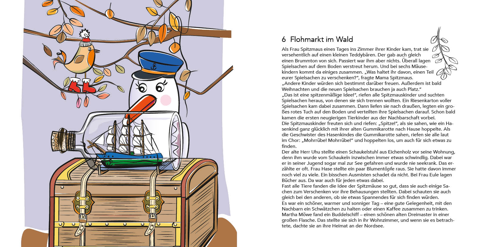Durch Zufall landet Martha Möwe bei den Tieren im Wald. Eigentlich lebt sie an der Nordsee und wollte weiter nach Süden, wo es im Winter schön warm ist. Im Wald lernt sie viele Tiere kennen. Erna Eule wird Marthas beste Freundin. So beschließt sie länger zu bleiben. Allmählich bekommt sie jedoch Heimweh. Ihr fehlen das Wasser und die Schiffe. Als Weihnachten vor der Tür steht, haben ihre Freunde einen Plan ...