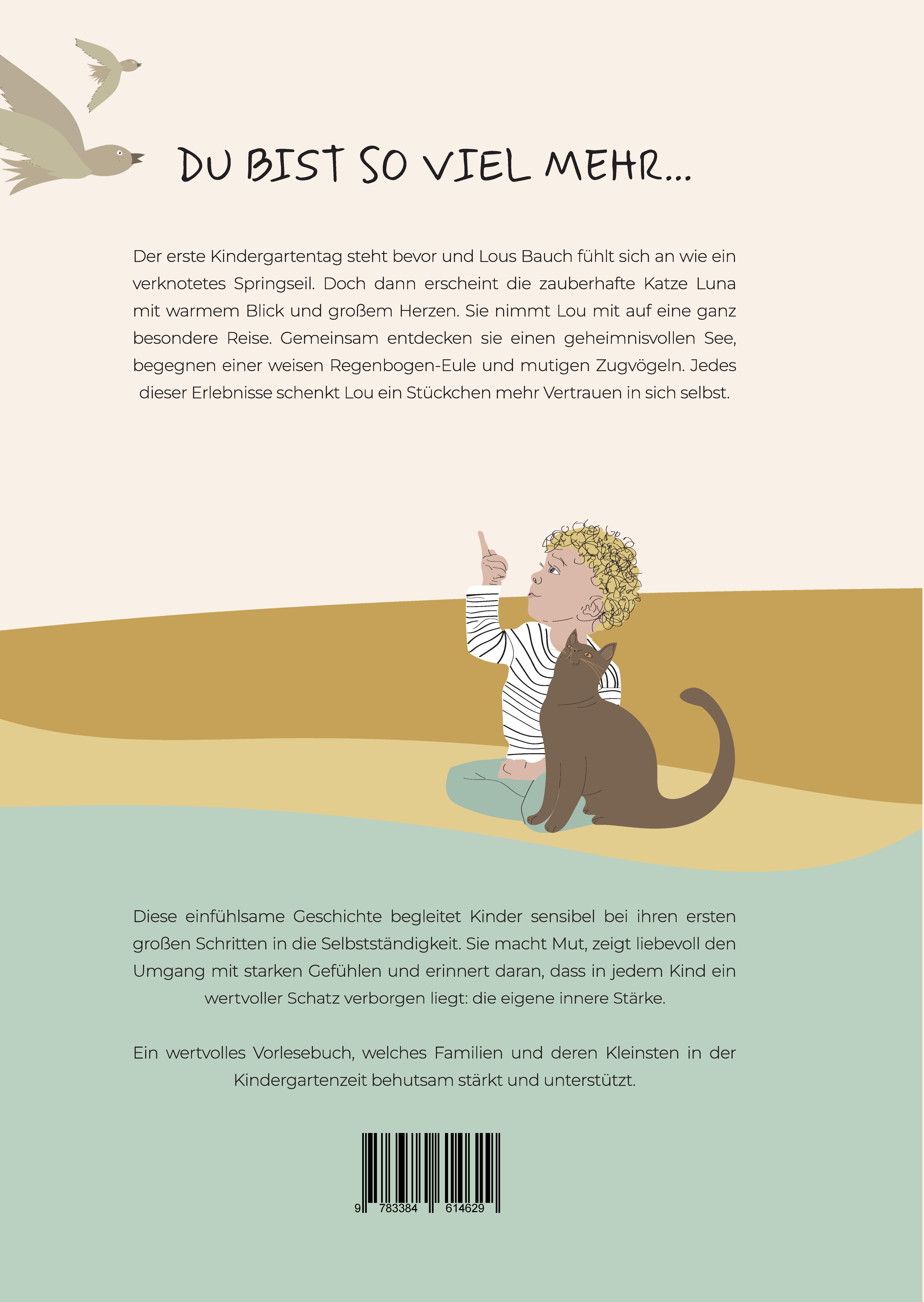 Der erste Kindergartentag steht bevor und Lous Bauch fühlt sich an wie ein verknotetes Springseil.Doch dann erscheint Luna, eine zauberhafte Katze mit warmem Blick und großem Herz. Sie nimmt Lou mit auf eine besondere Reise: Gemeinsam entdecken sie einen geheimnisvollen See, begegnen einer weisen Regenbogen-Eule und mutigen Zugvögeln.Jede Erfahrung schenkt Lou ein Stückchen mehr Vertrauen in sich selbst.Diese einfühlsame Geschichte begleitet Kinder sensibel bei ihren ersten großen Schritten in die Selbstständigkeit. Sie macht Mut, zeigt liebevoll den Umgang mit Gefühlen - und erinnert daran, dass in jedem Kind ein wertvoller Schatz verborgen liegt: die eigene innere Stärke.Ein wertvolles Vorlesebuch, welches Familien und deren Kleinsten in der Kindergartenzeit behutsam stärkt und unterstützt.